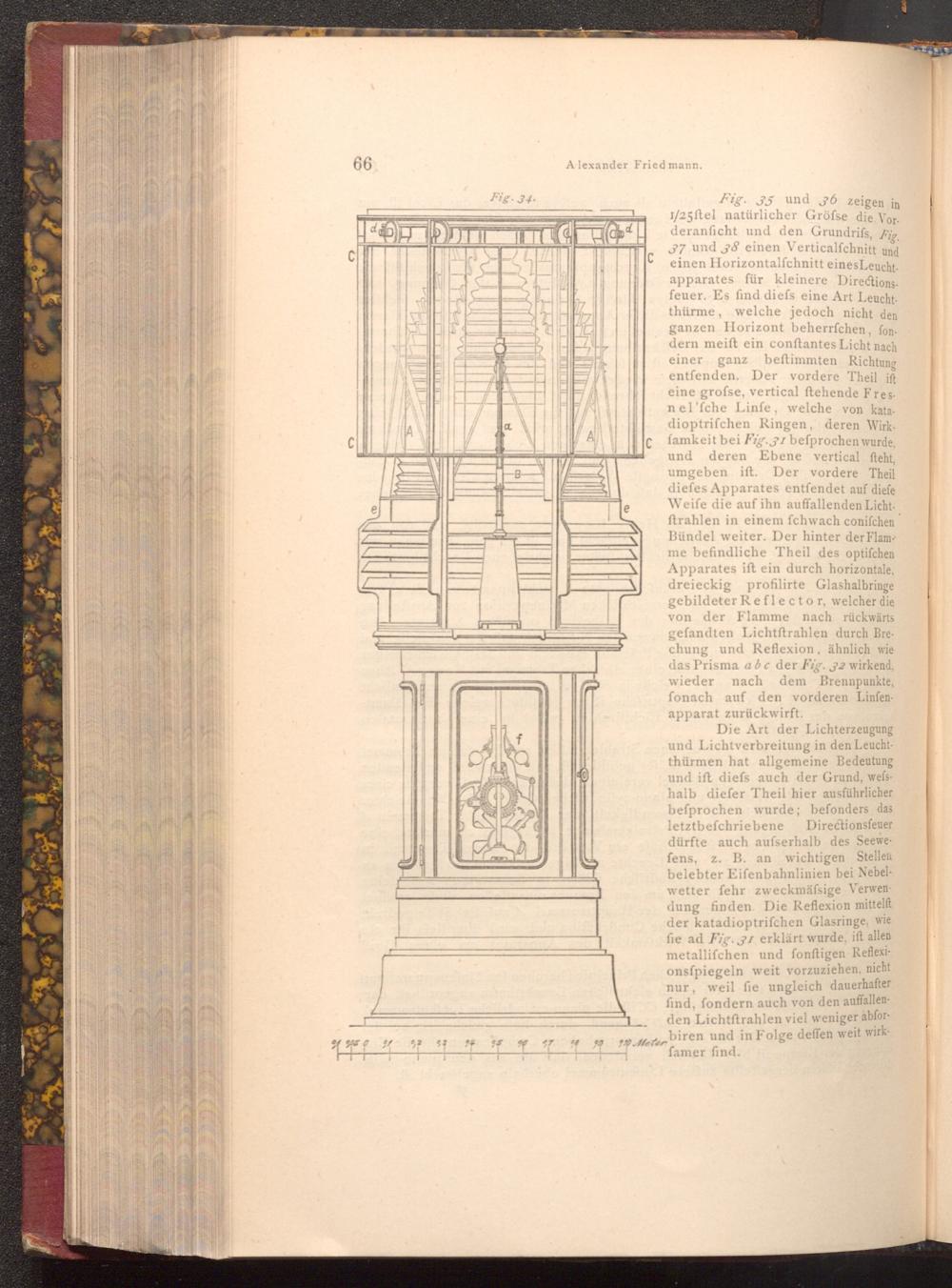 Die Art der Lichterzeugung und Lichtverbreitung in den Leuchtthürmen hat allgemeine Bedeutung und ift diefs auch der Grund, wefshalb diefer Theil hier ausführlicher befprochen wurde; befonders das letztbefchriebene Directionsfeuer dürfte auch aufserhalb des Seewefens, z. B. an wichtigen Stellen belebter Eifenbahnlinien bei Nebelwetter fehr zweckmäfsige Verwendung finden. Die Reflexion mittelft der katadioptrifchen Glasringe, wie fie ad Fig. 31 erklärt wurde, ift allen metallifchen und fonftigen Reflexionsfpiegeln weit vorzuziehen, nicht nur, weil fie ungleich dauerhafter find, fondern auch von den auffallenden Lichtftrahlen viel weniger abforbiren und in Folge deffen weit wirk