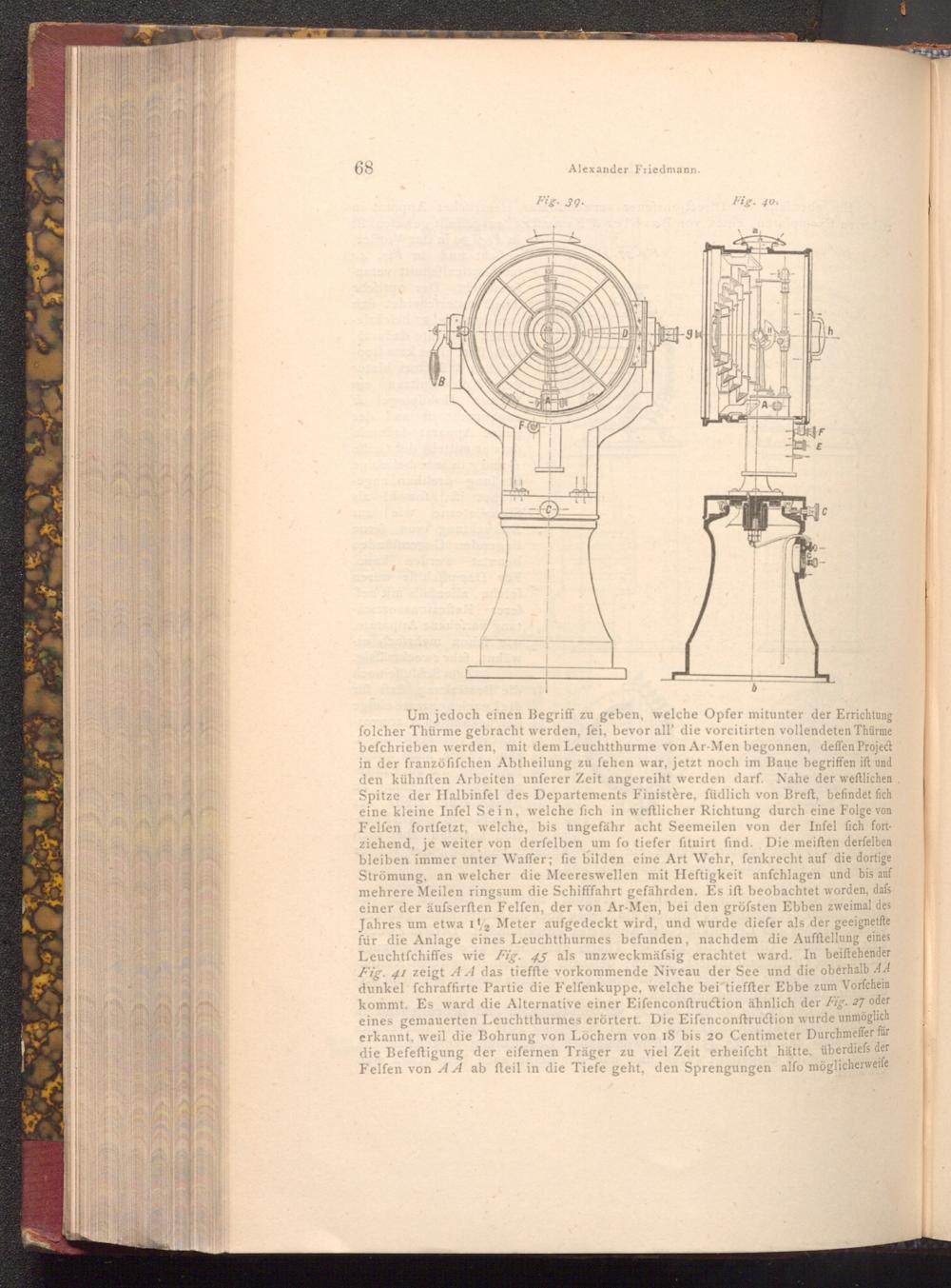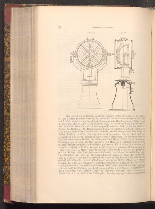 Um jedoch einen Begriff zu geben, welche Opfer mitunter der Errichtung folcher Thürme gebracht werden, fei, bevor all' die vorcitirten vollendeten Thürme befchrieben werden, mit dem Leuchtthurme von Ar- Men begonnen, deffen Project in der franzöfifchen Abtheilung zu fehen war, jetzt noch im Baue begriffen ift und den kühnften Arbeiten unferer Zeit angereiht werden darf. Nahe der weftlichen Spitze der Halbinfel des Departements Finistère, füdlich von Breft, befindet fich eine kleine Infel Sein, welche fich in weftlicher Richtung durch eine Folge von Felfen fortfetzt, welche, bis ungefähr acht Seemeilen von der Infel fich fortziehend, je weiter von derfelben um fo tiefer fituirt find. Die meiften derfelben bleiben immer unter Waffer; fie bilden eine Art Wehr, fenkrecht auf die dortige Strömung, an welcher die Meereswellen mit Heftigkeit anfchlagen und bis auf mehrere Meilen ringsum die Schifffahrt gefährden. Es ift beobachtet worden, dafs einer der äufserften Felfen, der von Ar- Men, bei den gröfsten Ebben zweimal des Jahres um etwa 12 Meter aufgedeckt wird, und wurde diefer als der geeignetfte für die Anlage eines Leuchtthurmes befunden, nachdem die Aufftellung eines Leuchtfchiffes wie Fig. 45 als unzweckmäfsig erachtet ward. In beiftehender Fig. 41 zeigt AA das tieffte vorkommende Niveau der See und die oberhalb AA dunkel fchraffirte Partie die Felfenkuppe, welche bei tieffter Ebbe zum Vorschein kommt. Es ward die Alternative einer Eifenconftruction ähnlich der Fig. 27 oder eines gemauerten Leuchtthurmes erörtert. Die Eifenconftruction wurde unmöglich erkannt, weil die Bohrung von Löchern von 18 bis 20 Centimeter Durchmeffer für die Befeftigung der eifernen Träger zu viel Zeit erheifcht hätte, überdiefs der Felfen von AA ab fteil in die Tiefe geht, den Sprengungen alfo möglicherweife