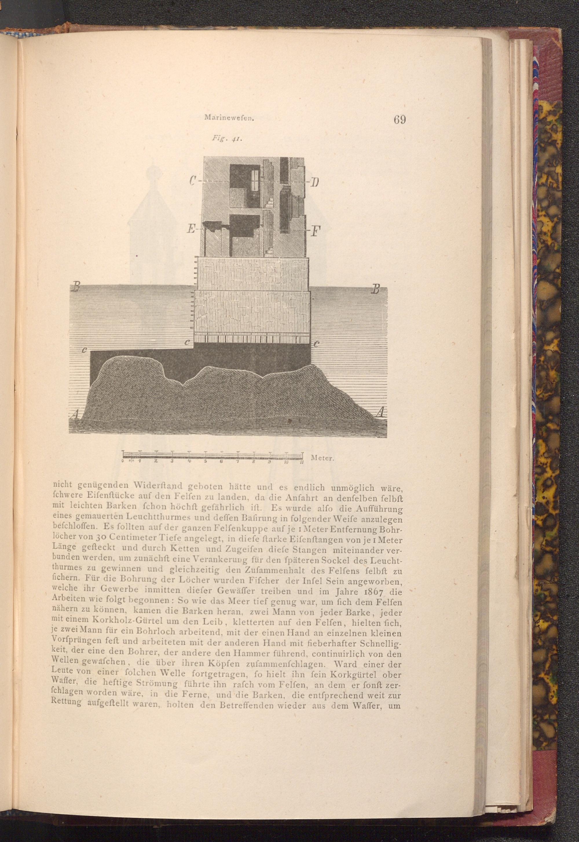 nicht genügenden Widerftand geboten hätte und es endlich unmöglich wäre, fchwere Eifenftücke auf den Felfen zu landen, da die Anfahrt an denfelben felbft mit leichten Barken fchon höchft gefährlich ift. Es wurde alfo die Aufführung eines gemauerten Leuchtthurmes und deffen Bafirung in folgender Weife anzulegen befchloffen. Es follten auf der ganzen Felfenkuppe auf je 1 Meter Entfernung Bohrlöcher von 30 Centimeter Tiefe angelegt, in diefe ftarke Eifenftangen von je I Meter Länge gefteckt und durch Ketten und Zugeifen diefe Stangen miteinander verbunden werden, um zunächft eine Verankerung für den fpäteren Sockel des Leuchtthurmes zu gewinnen und gleichzeitig den Zufammenhalt des Felfens felbft zu fichern. Für die Bohrung der Löcher wurden Fifcher der Infel Sein angeworben, welche ihr Gewerbe inmitten diefer Gewäffer treiben und im Jahre 1867 die Arbeiten wie folgt begonnen: So wie das Meer tief genug war, um fich dem Felfen nähern zu können, kamen die Barken heran, zwei Mann von jeder Barke, jeder mit einem Korkholz- Gürtel um den Leib, kletterten auf den Felfen, hielten fich, je zwei Mann für ein Bohrloch arbeitend, mit der einen Hand an einzelnen kleinen Vorfprüngen feft und arbeiteten mit der anderen Hand mit fieberhafter Schnelligkeit, der eine den Bohrer, der andere den Hammer führend, continuirlich von den Wellen gewafchen, die über ihren Köpfen zufammenfchlagen. Ward einer der Leute von einer folchen Welle fortgetragen, fo hielt ihn fein Korkgürtel ober Waffer, die heftige Strömung führte ihn rafch vom Felfen, an dem er fonft zerfchlagen worden wäre, in die Ferne, und die Barken, die entſprechend weit zur Rettung aufgeftellt waren, holten den Betreffenden wieder aus dem Waffer, um