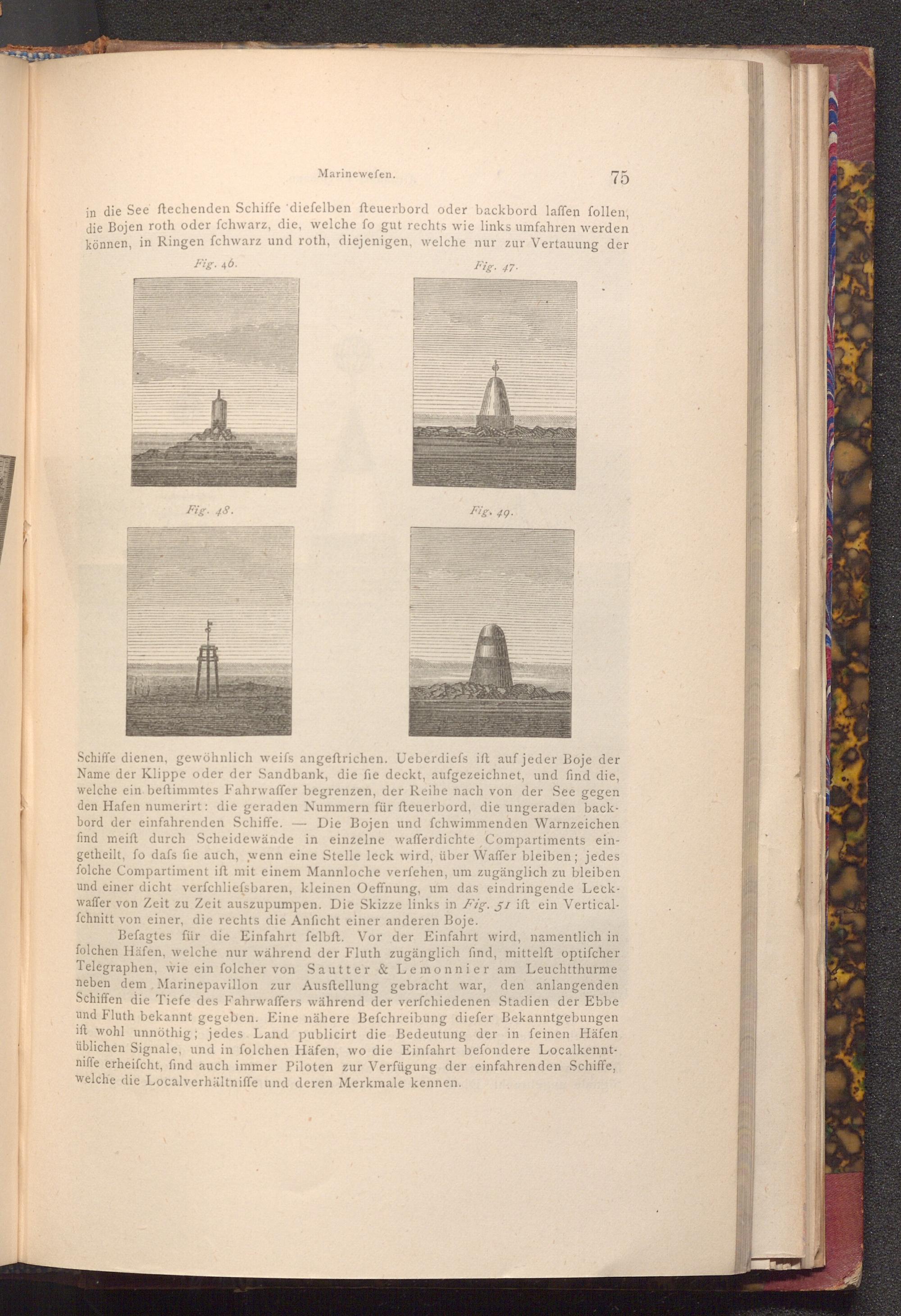 Befagtes für die Einfahrt felbft. Vor der Einfahrt wird, namentlich in folchen Häfen, welche nur während der Fluth zugänglich find, mittelft optifcher Telegraphen, wie ein folcher von Sautter& Lemonnier am Leuchtthurme neben dem Marinepavillon zur Ausftellung gebracht war, den anlangenden Schiffen die Tiefe des Fahrwaffers während der verfchiedenen Stadien der Ebbe und Fluth bekannt gegeben. Eine nähere Befchreibung diefer Bekanntgebungen ift wohl unnöthig; jedes Land publicirt die Bedeutung der in feinen Häfen üblichen Signale, und in folchen Häfen, wo die Einfahrt befondere Localkenntniffe erheifcht, find auch immer Piloten zur Verfügung der einfahrenden Schiffe, welche die Localverhältniffe und deren Merkmale kennen.