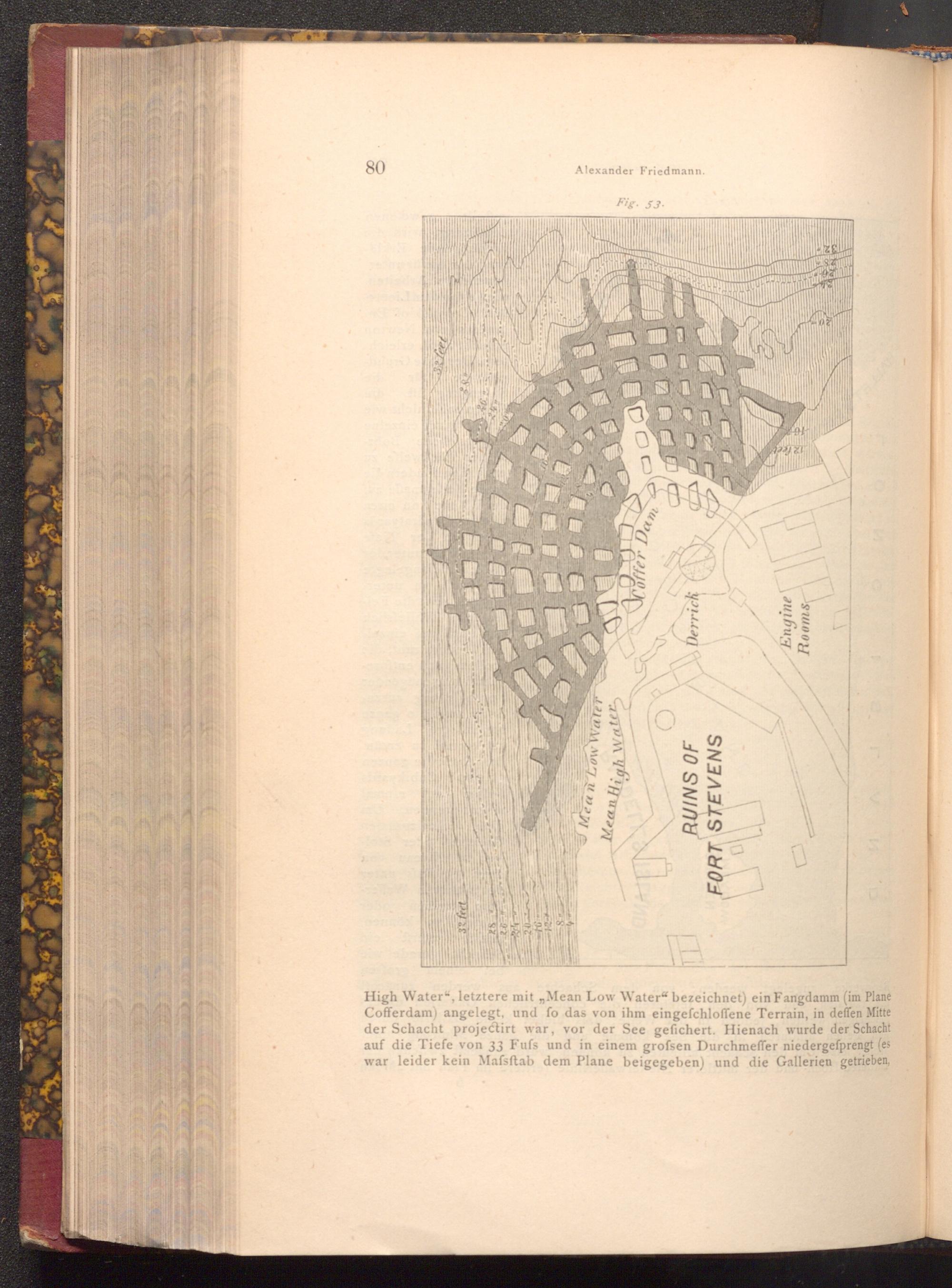 High Water", letztere mit ,, Mean Low Water" bezeichnet) ein Fangdamm( im Plane Cofferdam) angelegt, und fo das von ihm eingefchloffene Terrain, in deffen Mitte der Schacht projectirt war, vor der See gefichert. Hienach wurde der Schacht auf die Tiefe von 33 Fufs und in einem grofsen Durchmeffer niedergefprengt( es war leider kein Mafsftab dem Plane beigegeben) und die Gallerien getrieben,