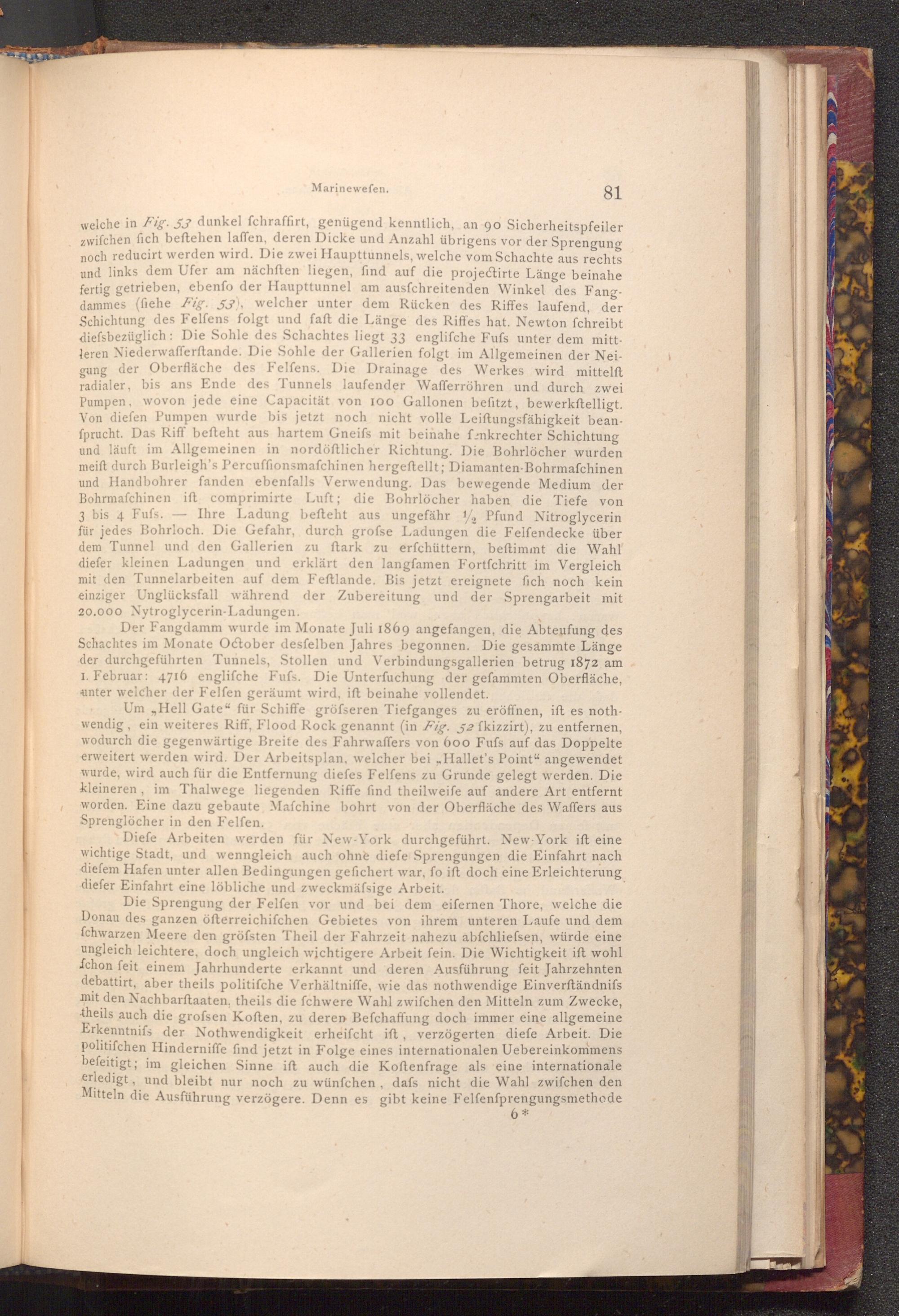 Um Hell Gate" für Schiffe gröfseren Tiefganges zu eröffnen, ift es nothwendig, ein weiteres Riff, Flood Rock genannt( in Fig. 52 fkizzirt), zu entfernen, wodurch die gegenwärtige Breite des Fahrwaffers von 600 Fufs auf das Doppelte erweitert werden wird. Der Arbeitsplan, welcher bei„ Hallet's Point" angewendet wurde, wird auch für die Entfernung diefes Felfens zu Grunde gelegt werden. Die kleineren, im Thalwege liegenden Riffe find theilweife auf andere Art entfernt worden. Eine dazu gebaute Mafchine bohrt von der Oberfläche des Waffers aus Sprenglöcher in den Felfen.