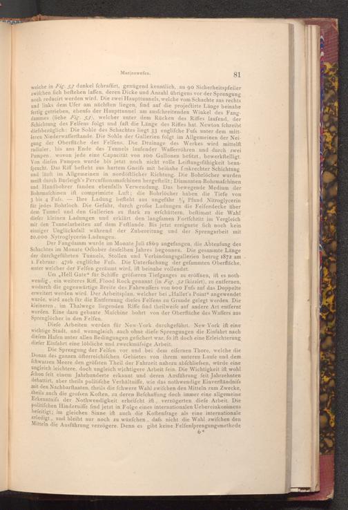 welche in Fig. 53 dunkel fchraffirt, genügend kenntlich, an 90 Sicherheitspfeiler zwifchen fich beftehen laffen, deren Dicke und Anzahl übrigens vor der Sprengung noch reducirt werden wird. Die zwei Haupttunnels, welche vom Schachte aus rechts und links dem Ufer am nächften liegen, find auf die projectirte Länge beinahe fertig getrieben, ebenfo der Haupttunnel am ausfchreitenden Winkel des Fangdammes( fiehe Fig. 53), welcher unter dem Rücken des Riffes laufend, der Schichtung des Felfens folgt und faft die Länge des Riffes hat. Newton fchreibt diefsbezüglich: Die Sohle des Schachtes liegt 33 englifche Fufs unter dem mittHeren Niederwafferftande. Die Sohle der Gallerien folgt im Allgemeinen der Neigung der Oberfläche des Felfens. Die Drainage des Werkes wird mittelft radialer, bis ans Ende des Tunnels laufender Wafferröhren und durch zwei Pumpen, wovon jede eine Capacität von 100 Gallonen befitzt, bewerkstelligt. Von diefen Pumpen wurde bis jetzt noch nicht volle Leiftungsfähigkeit beanfprucht. Das Riff befteht aus hartem Gneifs mit beinahe fenkrechter Schichtung und läuft im Allgemeinen in nordöftlicher Richtung. Die Bohrlöcher wurden meift durch Burleigh's Percuffionsmafchinen hergeſtellt; Diamanten Bohrmaschinen und Handbohrer fanden ebenfalls Verwendung. Das bewegende Medium der Bohrmaſchinen ift comprimirte Luft; die Bohrlöcher haben die Tiefe von 3 bis 4 Fufs. Ihre Ladung befteht aus ungefähr/ Pfund Nitroglycerin für jedes Bohrloch. Die Gefahr, durch grofse Ladungen die Felfendecke über dem Tunnel und den Gallerien zu ftark zu erfchüttern, beftimmt die Wahl diefer kleinen Ladungen und erklärt den langfamen Fortfchritt im Vergleich mit den Tunnelarbeiten auf dem Feftlande. Bis jetzt ereignete fich noch kein einziger Unglücksfall während der Zubereitung und der Sprengarbeit mit 20.000 Nytroglycerin- Ladungen.
