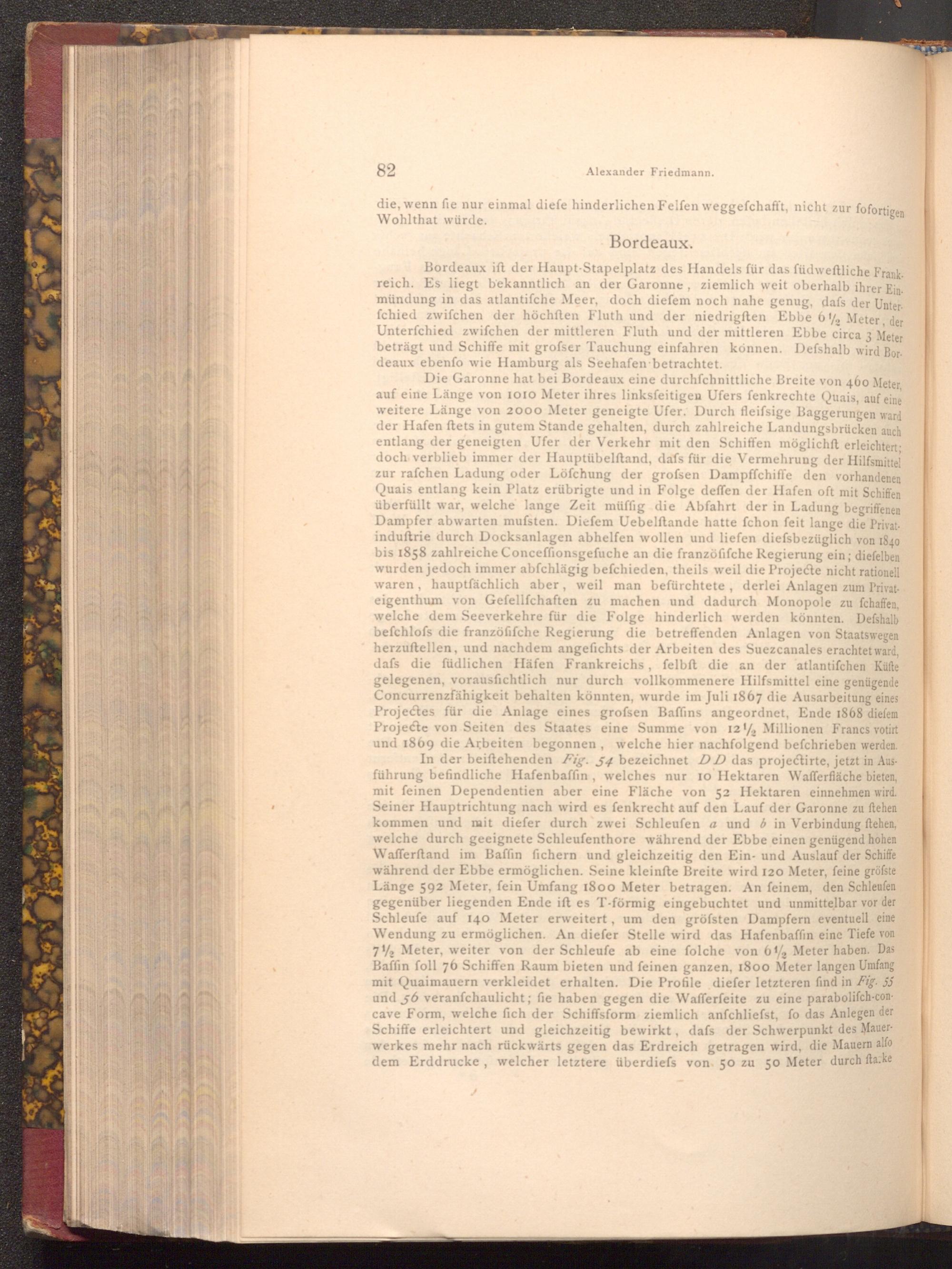Die Garonne hat bei Bordeaux eine durchſchnittliche Breite von 460 Meter, auf eine Länge von 1010 Meter ihres linksfeitigen Ufers fenkrechte Quais, auf eine weitere Länge von 2000 Meter geneigte Ufer. Durch fleifsige Baggerungen ward der Hafen ftets in gutem Stande gehalten, durch zahlreiche Landungsbrücken auch entlang der geneigten Ufer der Verkehr mit den Schiffen möglichft erleichtert; doch verblieb immer der Hauptübelftand, dafs für die Vermehrung der Hilfsmittel zur rafchen Ladung oder Löfchung der grofsen Dampffchiffe den vorhandenen Quais entlang kein Platz erübrigte und in Folge deffen der Hafen oft mit Schiffen überfüllt war, welche lange Zeit müffig die Abfahrt der in Ladung begriffenen Dampfer abwarten mufsten. Diefem Uebelftande hatte ſchon feit lange die Privatinduftrie durch Docksanlagen abhelfen wollen und liefen diefsbezüglich von 1840 bis 1858 zahlreiche Conceffionsgefuche an die franzöfifche Regierung ein; diefelben wurden jedoch immer abfchlägig befchieden, theils weil die Projecte nicht rationell waren, hauptfächlich aber, weil man befürchtete, derlei Anlagen zum Privateigenthum von Gefellſchaften zu machen und dadurch Monopole zu fchaffen, welche dem Seeverkehre für die Folge hinderlich werden könnten. Defshalb befchlofs die franzöfifche Regierung die betreffenden Anlagen von Staatswegen herzuftellen, und nachdem angefichts der Arbeiten des Suezcanales erachtet ward, dafs die füdlichen Häfen Frankreichs, felbft die an der atlantifchen Küfte gelegenen, vorausfichtlich nur durch vollkommenere Hilfsmittel eine genügende Concurrenzfähigkeit behalten könnten, wurde im Juli 1867 die Ausarbeitung eines Projectes für die Anlage eines grofsen Baffins angeordnet, Ende 1868 diefem Projecte von Seiten des Staates eine Summe von 12 Millionen Francs votirt und 1869 die Arbeiten begonnen, welche hier nachfolgend befchrieben werden. In der beiftehenden Fig. 54 bezeichnet DD das projectirte, jetzt in Ausführung befindliche Hafenbaffin, welches nur 10 Hektaren Wafferfläche bieten, mit feinen Dependentien aber eine Fläche von 52 Hektaren einnehmen wird. Seiner Hauptrichtung nach wird es fenkrecht auf den Lauf der Garonne zu ftehen kommen und mit diefer durch zwei Schleufen a und b in Verbindung ftehen, welche durch geeignete Schleufenthore während der Ebbe einen genügend hohen Wafferſtand im Baffin fichern und gleichzeitig den Ein- und Auslauf der Schiffe während der Ebbe ermöglichen. Seine kleinfte Breite wird 120 Meter, feine gröfste Länge 592 Meter, fein Umfang 1800 Meter betragen. An feinem, den Schleufen gegenüber liegenden Ende ift es T- förmig eingebuchtet und unmittelbar vor der Schleufe auf 140 Meter erweitert, um den gröfsten Dampfern eventuell eine Wendung zu ermöglichen. An diefer Stelle wird das Hafenbaffin eine Tiefe von 7½ Meter, weiter von der Schleufe ab eine folche von 6% Meter haben. Das Baffin foll 76 Schiffen Raum bieten und feinen ganzen, 1800 Meter langen Umfang mit Quaimauern verkleidet erhalten. Die Profile diefer letzteren find in Fig. 55 und 56 veranfchaulicht; fie haben gegen die Wafferfeite zu eine parabolifch- concave Form, welche fich der Schiffsform ziemlich anfchliefst, fo das Anlegen der Schiffe erleichtert und gleichzeitig bewirkt, dafs der Schwerpunkt des Mauerwerkes mehr nach rückwärts gegen das Erdreich getragen wird, die Mauern alfo dem Erddrucke, welcher letztere überdiefs von 50 zu 50 Meter durch fta: ke
