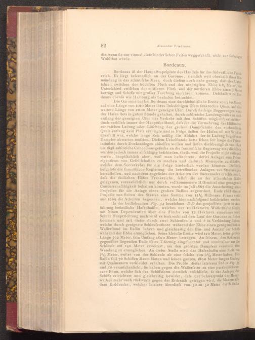 Bordeaux ift der Haupt- Stapelplatz des Handels für das füdweftliche Frankreich. Es liegt bekanntlich an der Garonne, ziemlich weit oberhalb ihrer Einmündung in das atlantifche Meer, doch diefem noch nahe genug, dafs der Unterfchied zwifchen der höchften Fluth und der niedrigften Ebbe 6½ Meter, der Unterfchied zwifchen der mittleren Fluth und der mittleren Ebbe circa 3 Meter beträgt und Schiffe mit grofser Tauchung einfahren können. Defshalb wird Bordeaux ebenso wie Hamburg als Seehafen betrachtet.