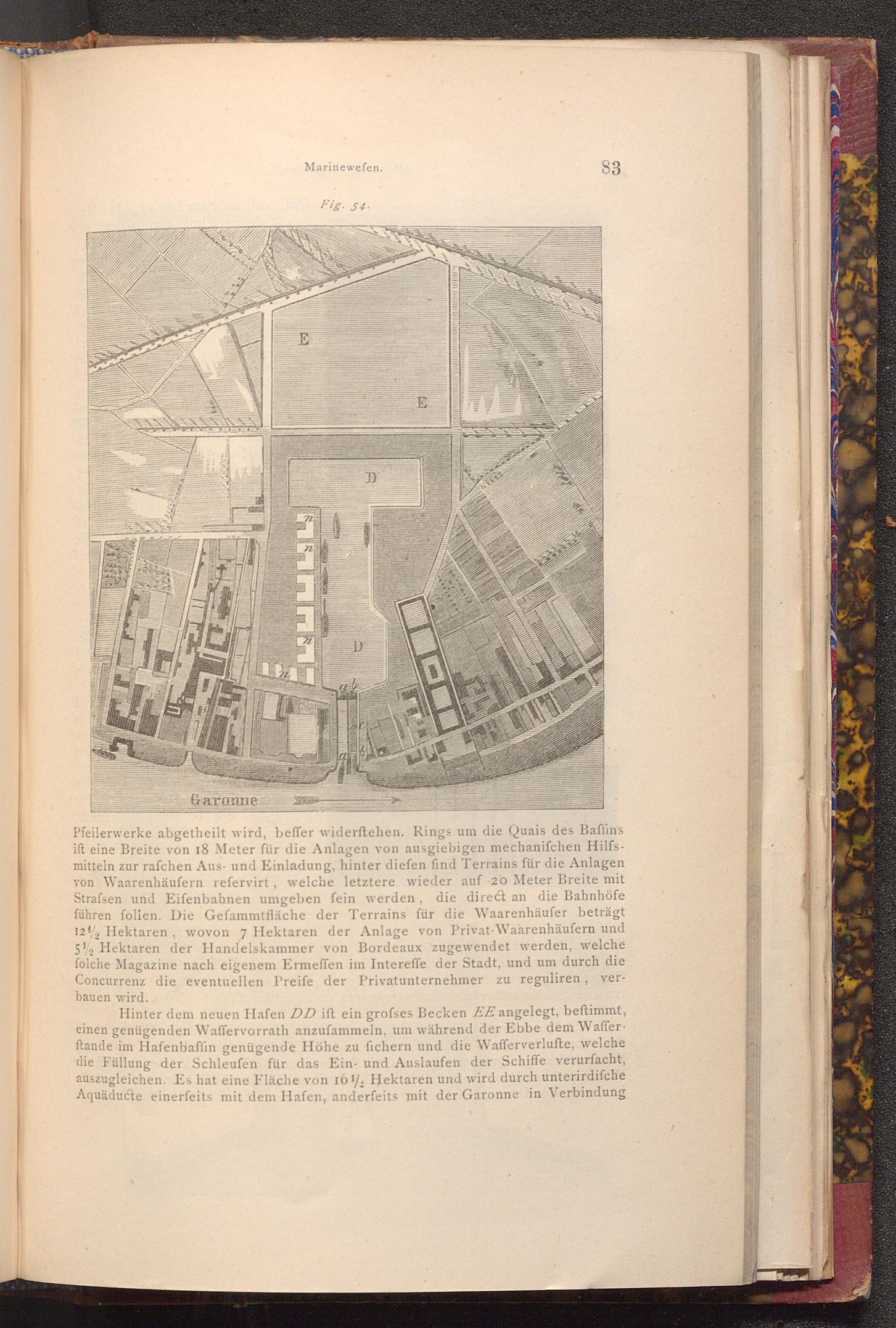 Pfeilerwerke abgetheilt wird, beffer widerftehen. Rings um die Quais des Baffins ift eine Breite von 18 Meter für die Anlagen von ausgiebigen mechanifchen Hilfsmitteln zur rafchen Aus- und Einladung, hinter diefen find Terrains für die Anlagen von Waarenhäufern refervirt, welche letztere wieder auf 20 Meter Breite mit Strafsen und Eifenbahnen umgeben fein werden, die direct an die Bahnhöfe führen folien. Die Gefammtfläche der Terrains für die Waarenhäufer beträgt 12% Hektaren, wovon 7 Hektaren der Anlage von Privat- Waarenhäufern und 5½ Hektaren der Handelskammer von Bordeaux zugewendet werden, welche folche Magazine nach eigenem Ermeffen im Intereffe der Stadt, und um durch die Concurrenz die eventuellen Preife der Privatunternehmer zu reguliren, verbauen wird.