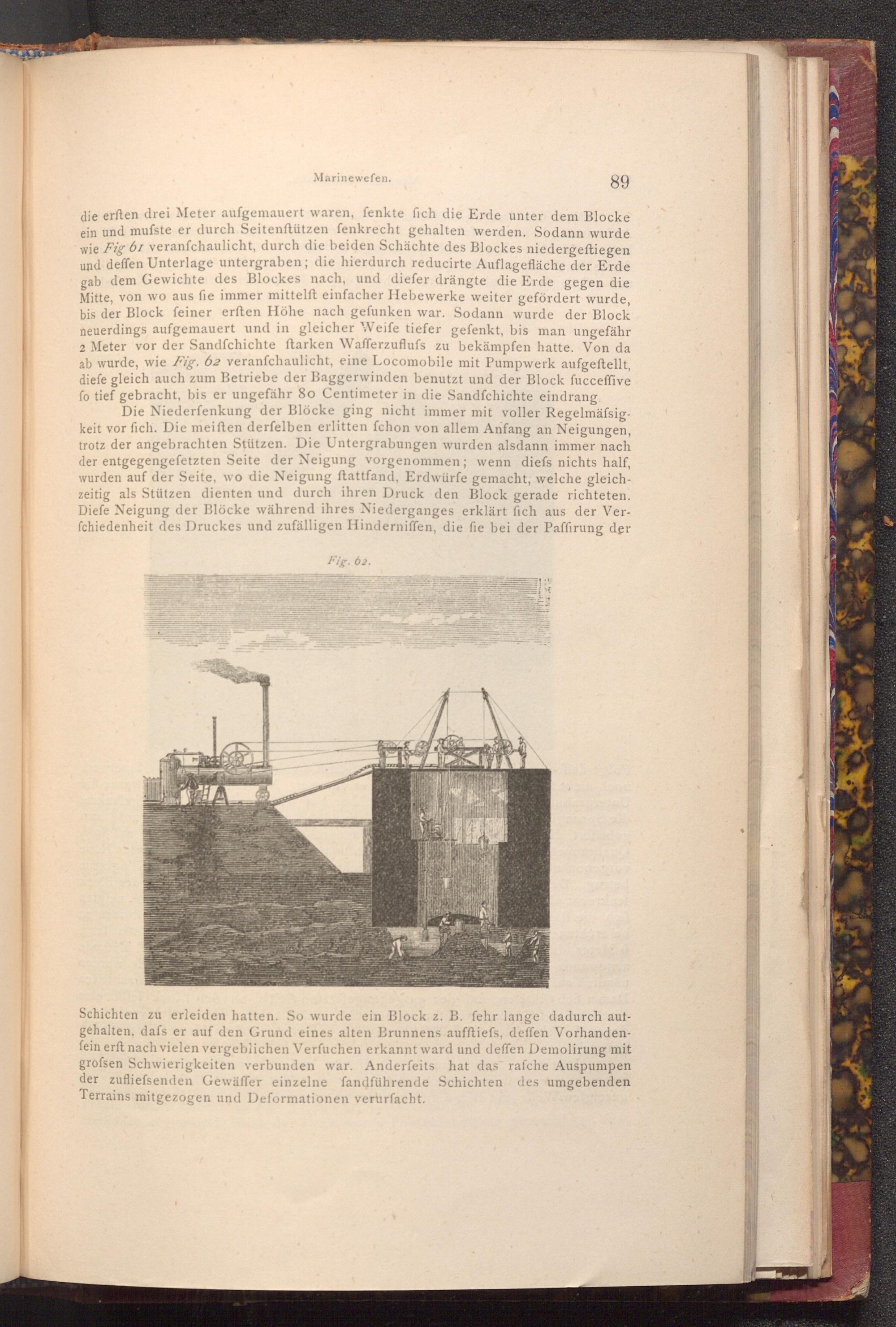 89 die erften drei Meter aufgemauert waren, fenkte fich die Erde unter dem Blocke ein und musste er durch Seitenftützen fenkrecht gehalten werden. Sodann wurde wie Fig 61 veranfchaulicht, durch die beiden Schächte des Blockes niedergeftiegen und deffen Unterlage untergraben; die hierdurch reducirte Auflagefläche der Erde gab dem Gewichte des Blockes nach, und diefer drängte die Erde gegen die Mitte, von wo aus fie immer mittelft einfacher Hebewerke weiter gefördert wurde, bis der Block feiner erften Höhe nach gefunken war. Sodann wurde der Block neuerdings aufgemauert und in gleicher Weife tiefer gefenkt, bis man ungefähr 2 Meter vor der Sandfchichte ftarken Wafferzuflufs zu bekämpfen hatte. Von da ab wurde, wie Fig. 62 veranfchaulicht, eine Locomobile mit Pumpwerk aufgeftellt, diefe gleich auch zum Betriebe der Baggerwinden benutzt und der Block fucceffive fo tief gebracht, bis er ungefähr 80 Centimeter in die Sandfchichte eindrang.