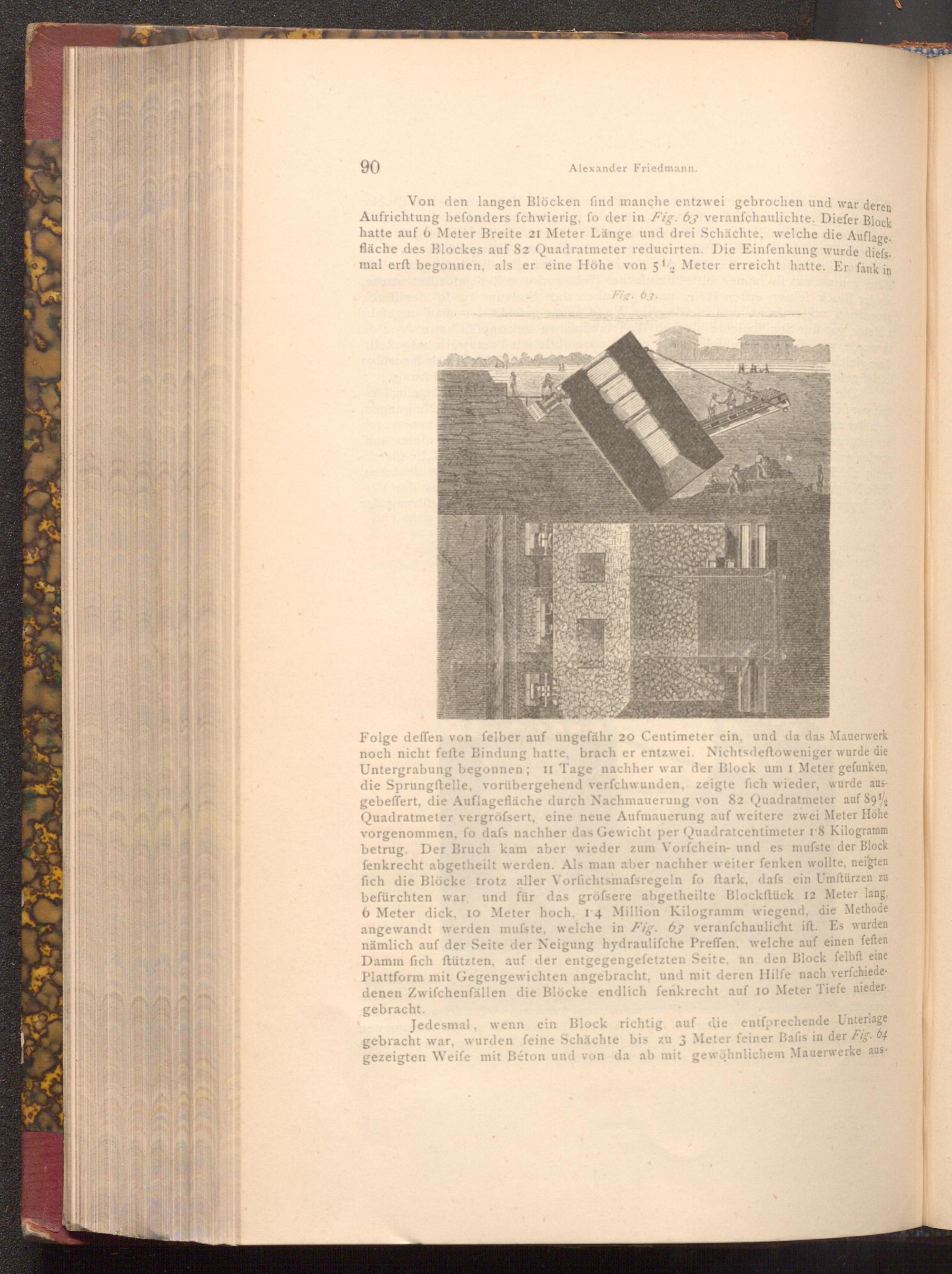 Folge deffen von felber auf ungefähr 20 Centimeter ein, und da das Mauerwerk noch nicht fefte Bindung hatte, brach er entzwei. Nichtsdeftoweniger wurde die Untergrabung begonnen; II Tage nachher war der Block um 1 Meter gefunken, die Sprungftelle, vorübergehend verfchwunden, zeigte fich wieder, wurde ausgebeffert, die Auflagefläche durch Nachmauerung von 82 Quadratmeter auf 89% Quadratmeter vergrössert, eine neue Aufmauerung auf weitere zwei Meter Höhe vorgenommen, fo dafs nachher das Gewicht per Quadratcentimeter 18 Kilogramm betrug. Der Bruch kam aber wieder zum Vorfchein- und es mufste der Block fenkrecht abgetheilt werden. Als man aber nachher weiter fenken wollte, neigten fich die Blöcke trotz aller Vorfichtsmafsregeln fo ftark, dafs ein Umſtürzen zu befürchten war, und für das gröfsere abgetheilte Blockftück 12 Meter lang, 6 Meter dick, 10 Meter hoch, 14 Million Kilogramm wiegend, die Methode angewandt werden musste, welche in Fig. 63 veranfchaulicht ift. Es wurden nämlich auf der Seite der Neigung hydraulifche Preffen, welche auf einen feften Damm fich ftützten, auf der entgegengefetzten Seite, an den Block felbft eine Plattform mit Gegengewichten angebracht, und mit deren Hilfe nach verfchiededenen Zwifchenfällen die Blöcke endlich fenkrecht auf 10 Meter Tiefe nieder gebracht.