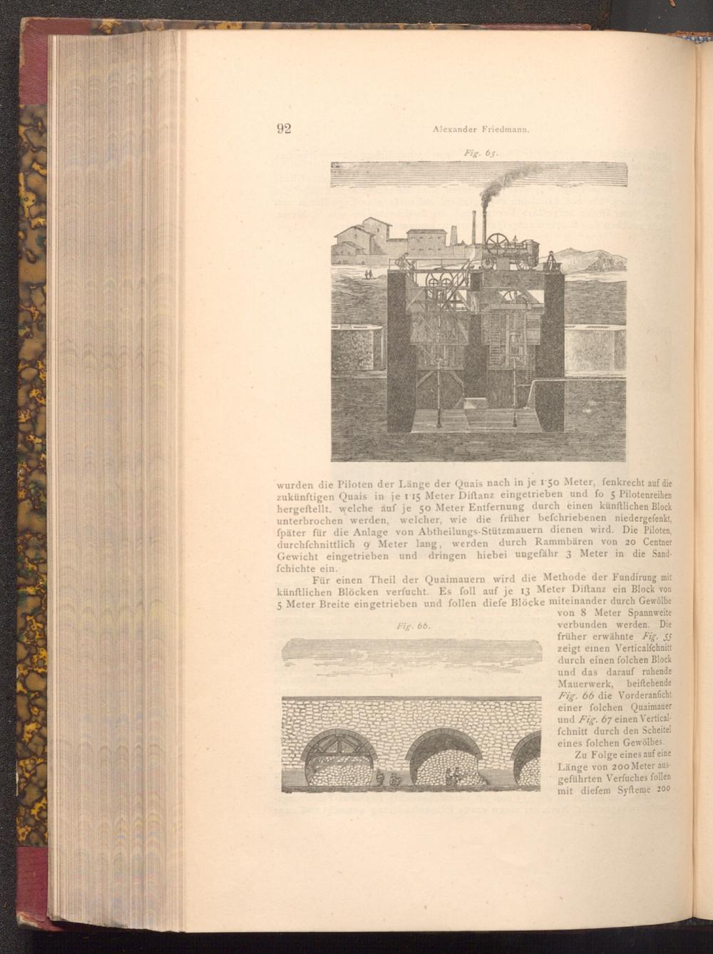 von 8 Meter Spannweite verbunden werden. Die früher erwähnte Fig. 55 zeigt einen Verticalfchnitt durch einen folchen Block und das darauf ruhende Mauerwerk, beiftehende Fig. 66 die Vorderanficht einer folchen Quaimauer. und Fig. 67 einen Verticalfchnitt durch den Scheitel eines folchen Gewölbes.