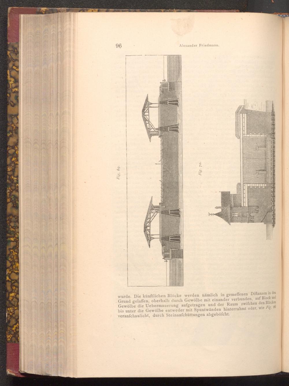 wurde. Die künftlichen Blöcke werden nämlich in gemeffenen Diftanzen in den Grund gelaffen, oberhalb durch Gewölbe mit einander verbunden, auf Block und Gewölbe die Uebermauerung aufgetragen und der Raum zwifchen den Blöcken bis unter die Gewölbe entweder mit Spuntwänden hinterrahmt oder, wie Fig. 6b veranfchaulicht, durch Steinanfchüttungen abgeböfcht.