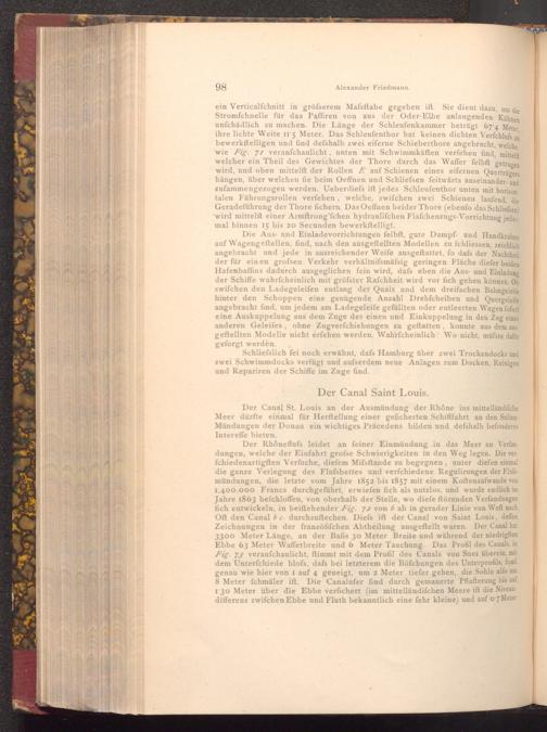 Der Rhôneflufs leidet an feiner Einmündung in das Meer an Verfandungen, welche der Einfahrt grofse Schwierigkeiten in den Weg legen. Die ver fchiedenartigften Verfuche, diefem Mifsftande zu begegnen, unter diefen einmal die ganze Verlegung des Flufsbettes und verfchiedene Regulirungen der Flufsmündungen, die letzte vom Jahre 1852 bis 1857 mit einem Koftenaufwande von 1,400.000 Francs durchgeführt, erwiefen fich als nutzlos, und wurde endlich im Jahre 1863 befchloffen, von oberhalb der Stelle, wo diefe ftörenden Verfandungen fich entwickeln, in beiftehender Fig. 72 von b ab in gerader Linie von Weft nach Oft den Canal b c durchzuftechen. Diefs ift der Canal von Saint Louis, deffen Zeichnungen in der franzöfifchen Abtheilung ausgeftellt waren. Der Canal hat 3300 Meter Länge, an der Bafis 30 Meter Breite und während der niedrigften Ebbe 63 Meter Wafferbreite und 6 Meter Tauchung. Das Profil des Canals, in Fig. 73 veranfchaulicht, ftimmt mit dem Profil des Canals von Suez überein, mit dem Unterfchiede blofs, dafs bei letzterem die Böfchungen des Unterprofils, fonft genau wie hier von I auf 4 geneigt, um 2 Meter tiefer gehen, die Sohle alfo um 8 Meter fchmäler ift. Die Canalufer find durch gemauerte Pflafterung bis auf 1:30 Meter über die Ebbe verfichert( im mittelländifchen Meere ift die Niveaudifferenz zwifchen Ebbe und Fluth bekanntlich eine fehr kleine) und auf o'7 Meter