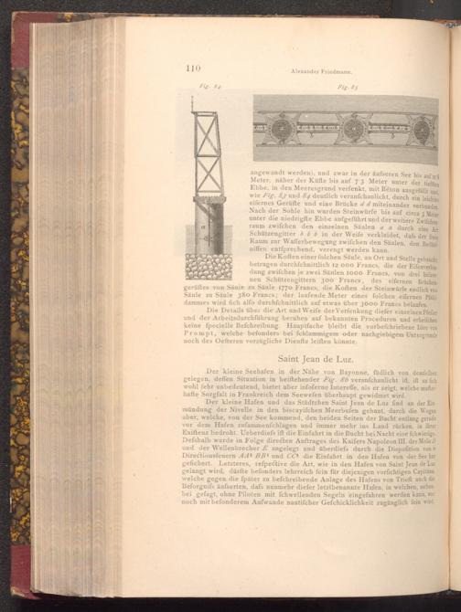 Die Koften einer folchen Säule, an Ort und Stelle gebracht, betragen durchſchnittlich 12.000 Francs, die der Eifenverbin dung zwifchen je zwei Säulen 1000 Francs, von drei hölzernen Schützengittern 300 Francs, des eifernen Brückengerüftes von Säule zu Säule 1770 Francs, die Koften der Steinwürfe endlich von Säule zu Säule 380 Francs; der laufende Meter eines folchen eifernen Pfahl. dammes wird fich alfo durchſchnittlich auf etwas über 3000 Francs belaufen.