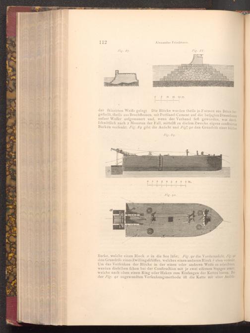 der fkizzirten Weife gelegt Die Blöcke wurden theils in Formen aus Béton hergeftellt, theils aus Bruchfteinen, mit Portland- Cement auf die befagten Dimenfionen aufser Waffer aufgemauert und, wenn der Verband feft geworden, was durchfchnittlich nach 2 Monaten der Fall, mittelft zu diefem Zwecke eigens conftruirten Barken verfenkt. Fig. 89 gibt die Anficht und Fig 90 den Grundrifs einer folchen