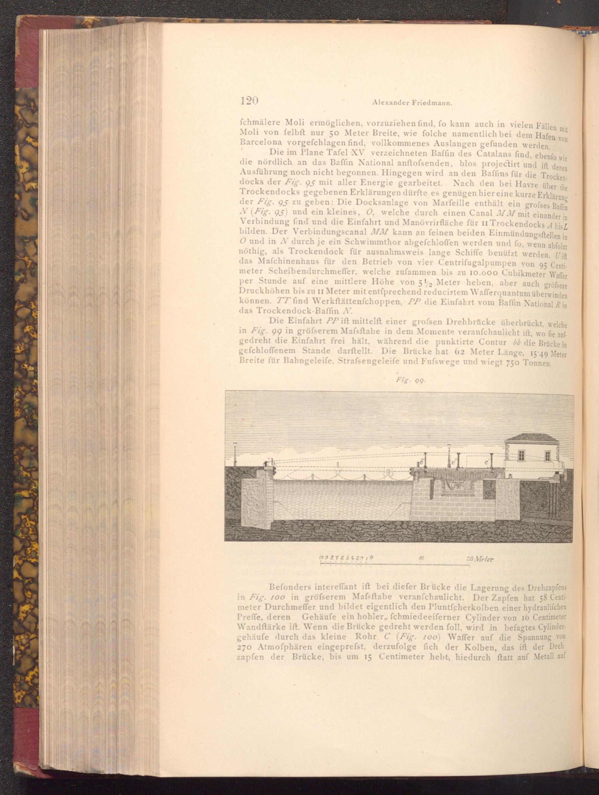Die Einfahrt PP ift mittelft einer grofsen Drehbrücke überbrückt, welche in Fig. 99 in gröfserem Mafsftabe in dem Momente veranfchaulicht ift, wo fie aufgedreht die Einfahrt frei hält, während die punktirte Contur bb die Brücke in gefchloffenem Stande darftellt. Die Brücke hat 62 Meter Länge, 15:49 Meter Breite für Bahngeleife, Strafsengeleife und Fufswege und wiegt 750 Tonnen.