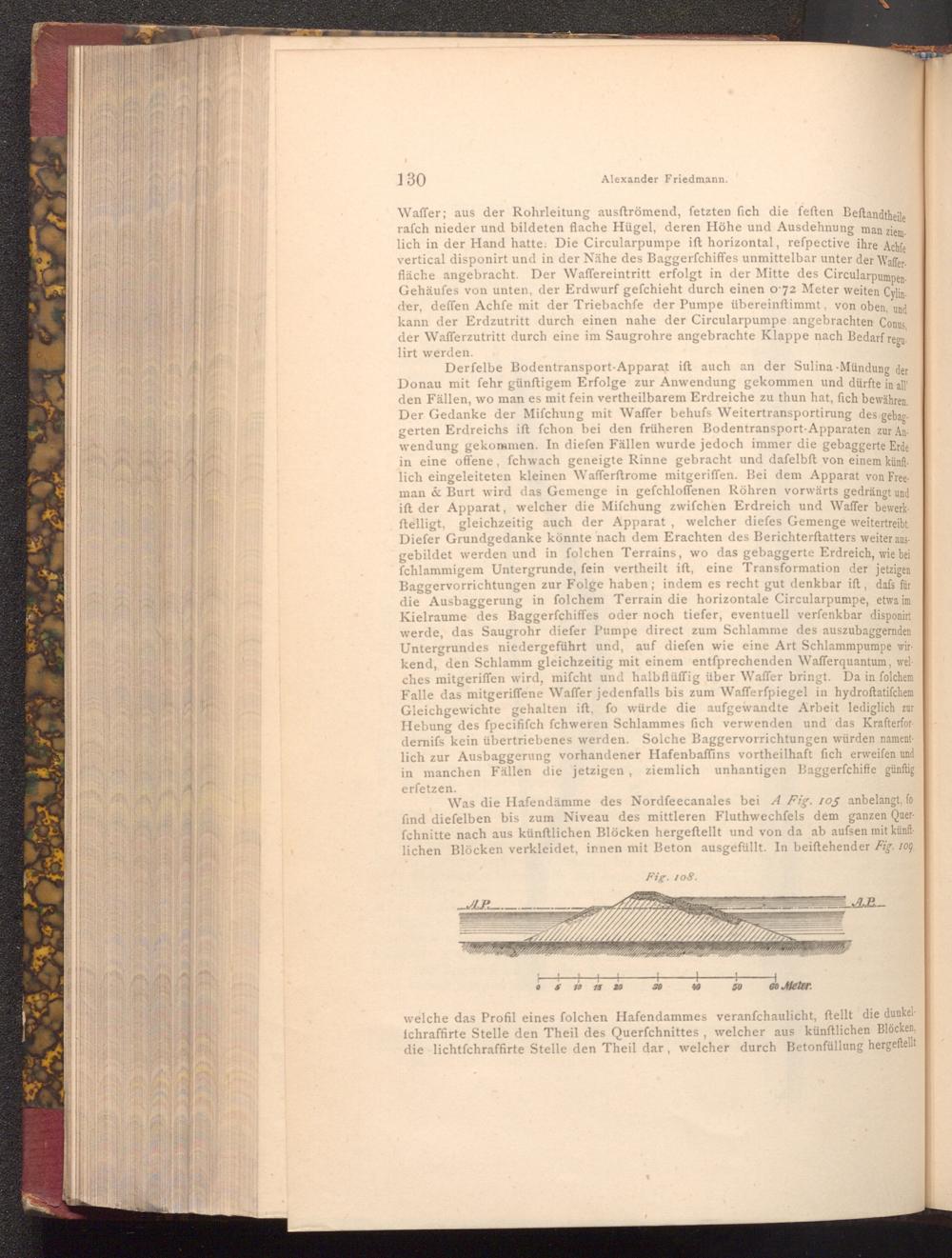 Waffer; aus der Rohrleitung ausftrömend, fetzten fich die feften Beftandtheile rafch nieder und bildeten flache Hügel, deren Höhe und Ausdehnung man ziemlich in der Hand hatte. Die Circularpumpe ift horizontal, refpective ihre Achfe vertical disponirt und in der Nähe des Baggerfchiffes unmittelbar unter der Waffer fläche angebracht. Der Waffereintritt erfolgt in der Mitte des CircularpumpenGehäuſes von unten, der Erdwurf gefchieht durch einen 0 72 Meter weiten Cylin der, deffen Achfe mit der Triebachfe der Pumpe übereinftimmt, von oben, und kann der Erdzutritt durch einen nahe der Circularpumpe angebrachten Conus, der Wafferzutritt durch eine im Saugrohre angebrachte Klappe nach Bedarf regu
