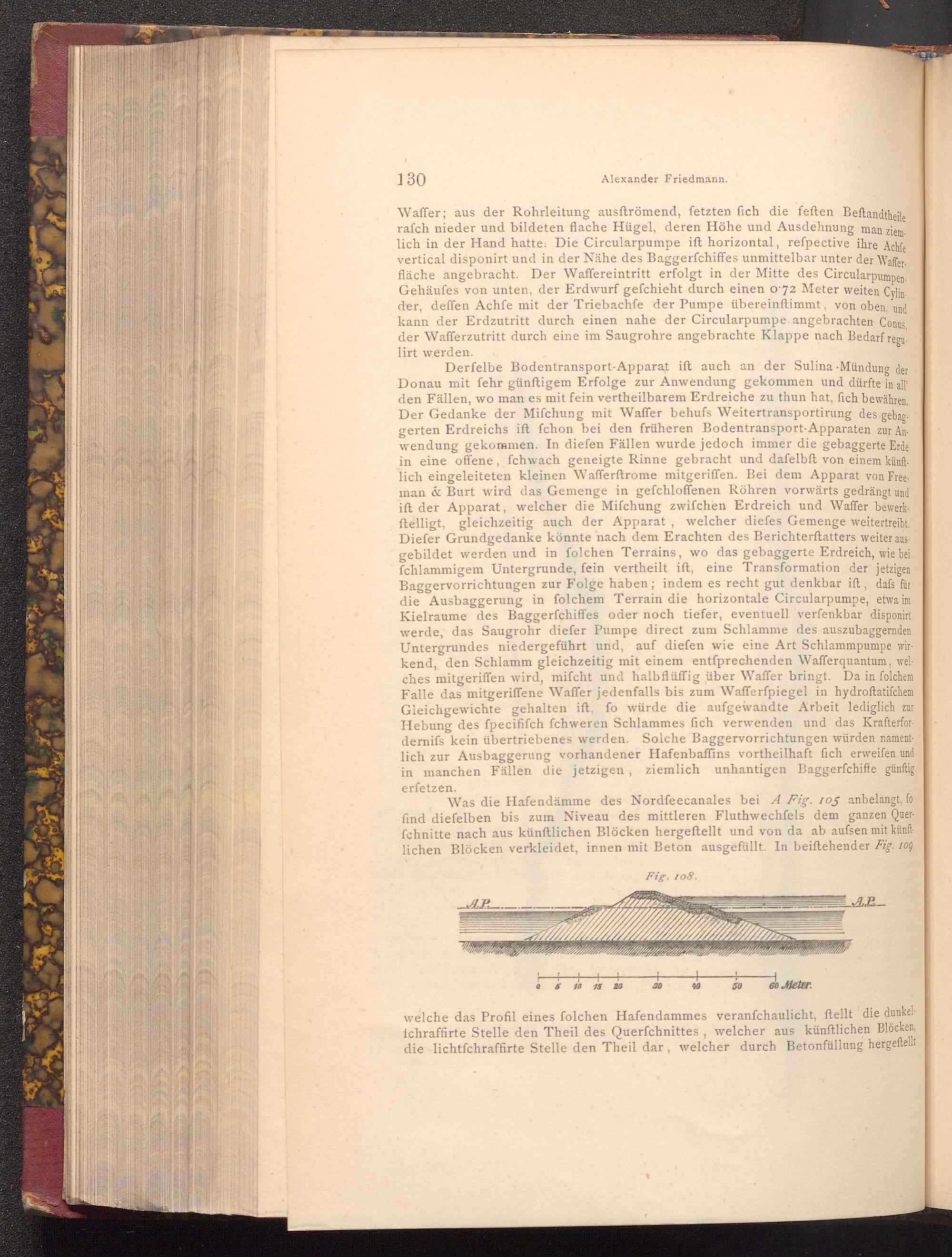 welche das Profil eines folchen Hafendammes veranfchaulicht, ftellt die dunkel ichraffirte Stelle den Theil des Querfchnittes, welcher aus künftlichen Blöcken, die lichtfchraffirte Stelle den Theil dar, welcher durch Betonfüllung hergeftellt