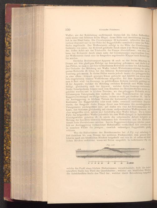 Derfelbe Bodentransport- Apparat ift auch an der Sulina Mündung der Donau mit fehr günftigem Erfolge zur Anwendung gekommen und dürfte in all' den Fällen, wo man es mit fein vertheilbarem Erdreiche zu thun hat, fich bewähren. Der Gedanke der Mifchung mit Waffer behufs Weitertransportirung des gebaggerten Erdreichs ift fchon bei den früheren Bodentransport- Apparaten zur Anwendung gekommen. In diefen Fällen wurde jedoch immer die gebaggerte Erde in eine offene, fchwach geneigte Rinne gebracht und dafelbft von einem künft lich eingeleiteten kleinen Wafferftrome mitgeriffen. Bei dem Apparat von Freeman& Burt wird das Gemenge in gefchloffenen Röhren vorwärts gedrängt und ift der Apparat, welcher die Mifchung zwifchen Erdreich und Waffer bewerkftelligt, gleichzeitig auch der Apparat, welcher diefes Gemenge weitertreibt. Diefer Grundgedanke könnte nach dem Erachten des Berichterstatters weiter ausgebildet werden und in folchen Terrains, wo das gebaggerte Erdreich, wie bei fchlammigem Untergrunde, fein vertheilt ift, eine Transformation der jetzigen Baggervorrichtungen zur Folge haben; indem es recht gut denkbar ift, dafs für die Ausbaggerung in folchem Terrain die horizontale Circularpumpe, etwa im Kielraume des Baggerfchiffes oder noch tiefer, eventuell verfenkbar disponirt werde, das Saugrohr diefer Pumpe direct zum Schlamme des auszubaggernden Untergrundes niedergeführt und, auf diefen wie eine Art Schlammpumpe wirkend, den Schlamm gleichzeitig mit einem entſprechenden Wafferquantum, welches mitgeriffen wird, mifcht und halbflüffig über Waffer bringt. Da in folchem Falle das mitgeriffene Waffer jedenfalls bis zum Wafferfpiegel in hydroftatifchem Gleichgewichte gehalten ift, fo würde die aufgewandte Arbeit lediglich zur Hebung des fpecififch fchweren Schlammes fich verwenden und das Krafterfor dernifs kein übertriebenes werden. Solche Baggervorrichtungen würden nament lich zur Ausbaggerung vorhandener Hafenbaffins vortheilhaft fich erweifen und in manchen Fällen die jetzigen, ziemlich unhantigen Baggerfchiffe günftig erfetzen.