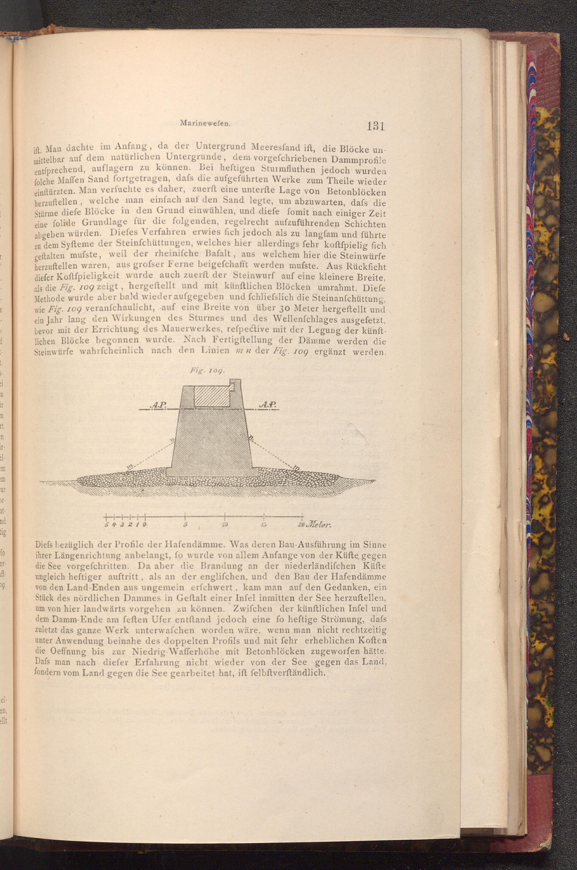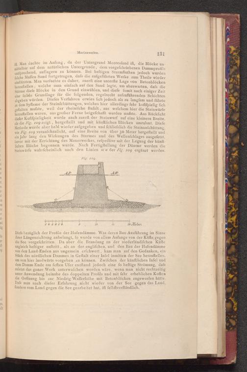 ift. Man dachte im Anfang, da der Untergrund Meeresfand ift, die Blöcke unmittelbar auf dem natürlichen Untergrunde, dem vorgefchriebenen Dammprofile entfprechend, auflagern zu können. Bei heftigen Sturmfluthen jedoch wurden folche Maffen Sand fortgetragen, dafs die aufgeführten Werke zum Theile wieder einftürzten. Man verfuchte es daher, zuerft eine unterfte Lage von Betonblöcken herzuftellen, welche man einfach auf den Sand legte, um abzuwarten, dafs die Stürme diefe Blöcke in den Grund einwühlen, und diefe fomit nach einiger Zeit eine folide Grundlage für die folgenden, regelrecht aufzuführenden Schichten abgeben würden. Diefes Verfahren erwies fich jedoch als zu langfam und führte zu dem Syfteme der Steinfchüttungen, welches hier allerdings fehr koftfpielig fich geftalten mufste, weil der rheiniſche Bafalt, aus welchem hier die Steinwürfe herzuftellen waren, aus grofser Ferne beigefchafft werden mufste. Aus Rückficht diefer Koftfpieligkeit wurde auch zuerft der Steinwurf auf eine kleinere Breite, als die Fig. 109 zeigt, hergeftellt und mit künftlichen Blöcken umrahmt. Diefe Methode wurde aber bald wieder aufgegeben und fchliefslich die Steinanfchüttung, wie Fig. 109 veranschaulicht, auf eine Breite von über 30 Meter hergeſtellt und ein Jahr lang den Wirkungen des Sturmes und des Wellenfchlages ausgefetzt, bevor mit der Errichtung des Mauerwerkes, refpective mit der Legung der künftlichen Blöcke begonnen wurde. Nach Fertigftellung der Dämme werden die Steinwürfe wahrscheinlich nach den Linien m n der Fig. 109 ergänzt werden.