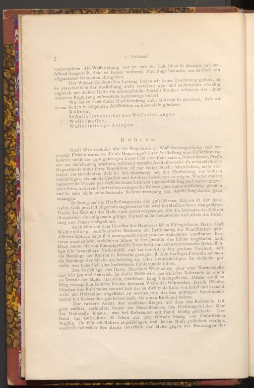 Nicht allzu reichlich war die Expofition an Wafferleitungsröhren und nur wenige Firmen waren es, die als Hauptobject ihrer Ausftellung eine Collection von Röhren nebft der dazu gehörigen Ueberficht über Fabrication, Dimenfionen, Preife etc. zur Anfchauung brachten, während manche Ausfteller mehr als nebenfächliche Gegenftände unter ihrer Expofition, oft nur einige Stücke fehen liefsen, mehr vielleicht, um anzudeuten, dafs fie fich überhaupt mit der Herftellung von Röhren befchäftigen, als um die Qualität und Art ihres Fabricates zu zeigen. Wieder andere bedeutende Firmen aus verfchiedenen Ländern( namentlich England) haben gegenüber ihren anderen Fabricationszweigen die Röhren ganz unberücksichtigt gelaffen nnd fo ihre nicht unbedeutende Röhrenerzeugung der Ausftellungskritik ganz entzogen.