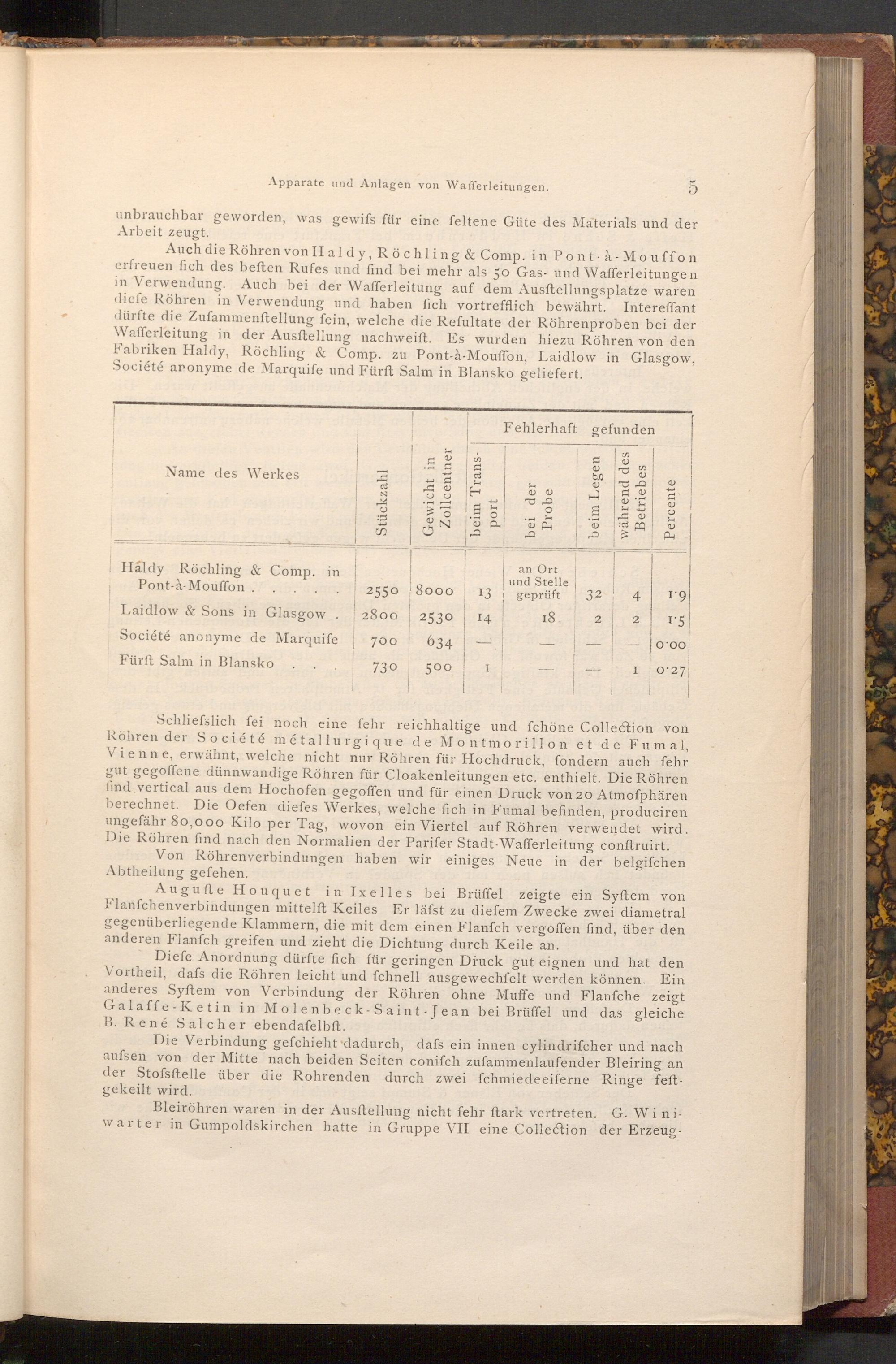 Auch die Röhren von Haldy, Röchling& Comp. in Pont- à- Mouffon erfreuen fich des beften Rufes und find bei mehr als 50 Gas- und Wafferleitungen in Verwendung. Auch bei der Wafferleitung auf dem Ausftellungsplatze waren diefe Röhren in Verwendung und haben fich vortrefflich bewährt. Intereffant dürfte die Zufammenftellung fein, welche die Refultate der Röhrenproben bei der Wafferleitung in der Ausftellung nachweift. Es wurden hiezu Röhren von den Fabriken Haldy, Röchling& Comp. zu Pont- à- Mouffon, Laidlow in Glasgow, Société anonyme de Marquife und Fürft Salm in Blansko geliefert.