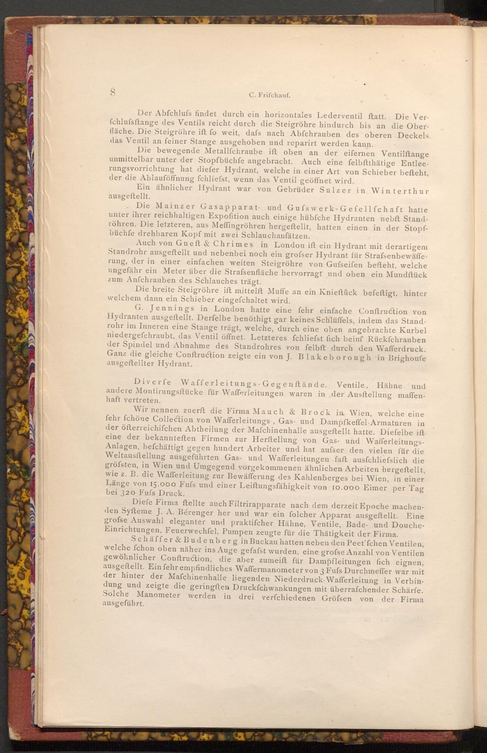 Wir nennen zuerft die Firma Mauch& Brock in Wien, welche eine fehr fchöne Collection von Wafferleitungs, Gas- und Dampfkeffel- Armaturen in der öfterreichifchen Abtheilung der Maſchinenhalle ausgeftellt hatte. Diefelbe ift eine der bekannteften Firmen zur Herftellung von Gas- und WafferleitungsAnlagen, befchäftigt gegen hundert Arbeiter und hat aufser den vielen für die Weltausstellung ausgeführten Gas- und Wafferleitungen faft ausfchliefslich die gröfsten, in Wien und Umgegend vorgekommenen ähnlichen Arbeiten hergestellt, wie z. B. die Wafferleitung zur Bewäfferung des Kahlenberges bei Wien, in einer Länge von 15.000 Fufs und einer Leiftungsfähigkeit von 10.000 Eimer per Tag bei 320 Fufs Druck.
