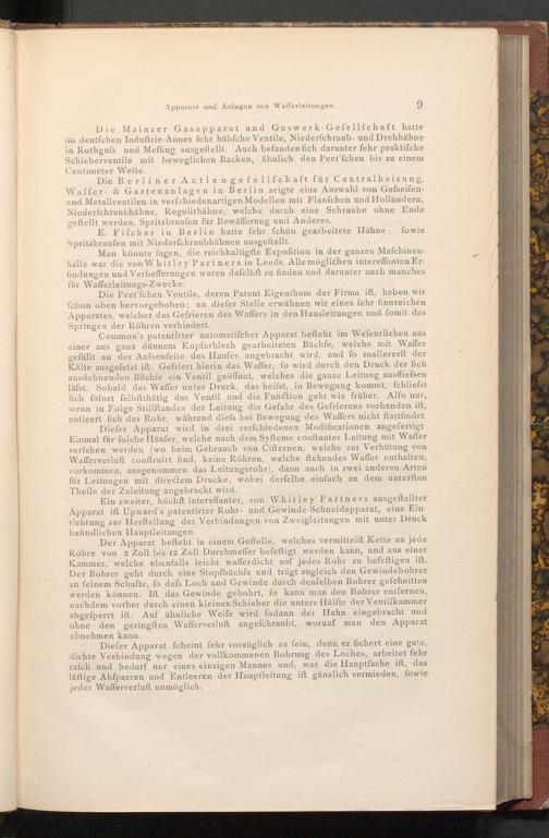 Man könnte fagen, die reichhaltigfte Expofition in der ganzen Mafchinenhalle war die von Whitley Partners in Leeds. Alle möglichen intereffanten Erfindungen und Verbefferungen waren dafelbft zu finden und darunter auch manches für Wafferleitungs- Zwecke.