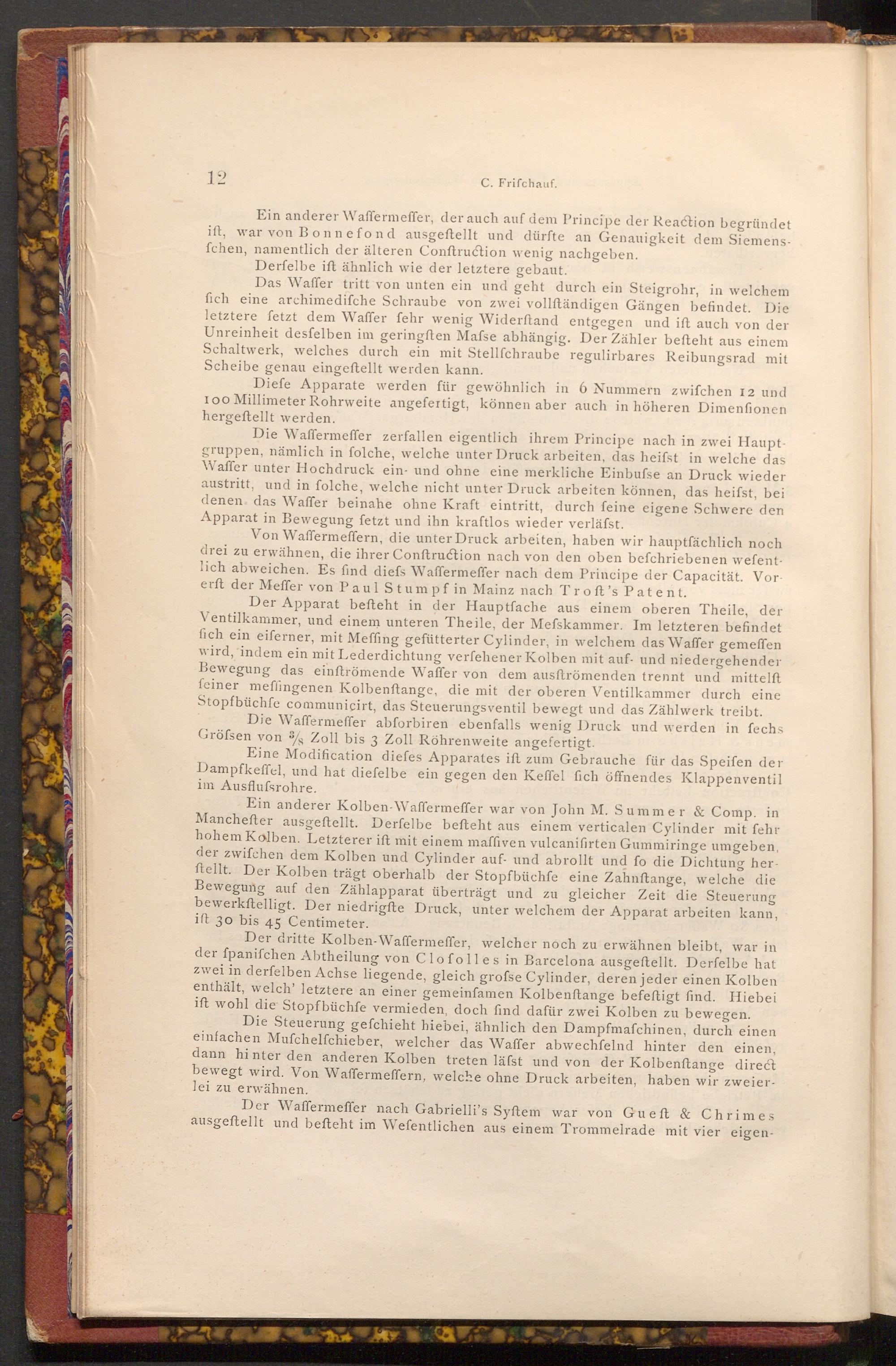 Ein anderer Waffermeffer, der auch auf dem Principe der Reaction begründet ift, war von Bonnefond ausgeftellt und dürfte an Genauigkeit dem Siemensfchen, namentlich der älteren Conftruction wenig nachgeben.