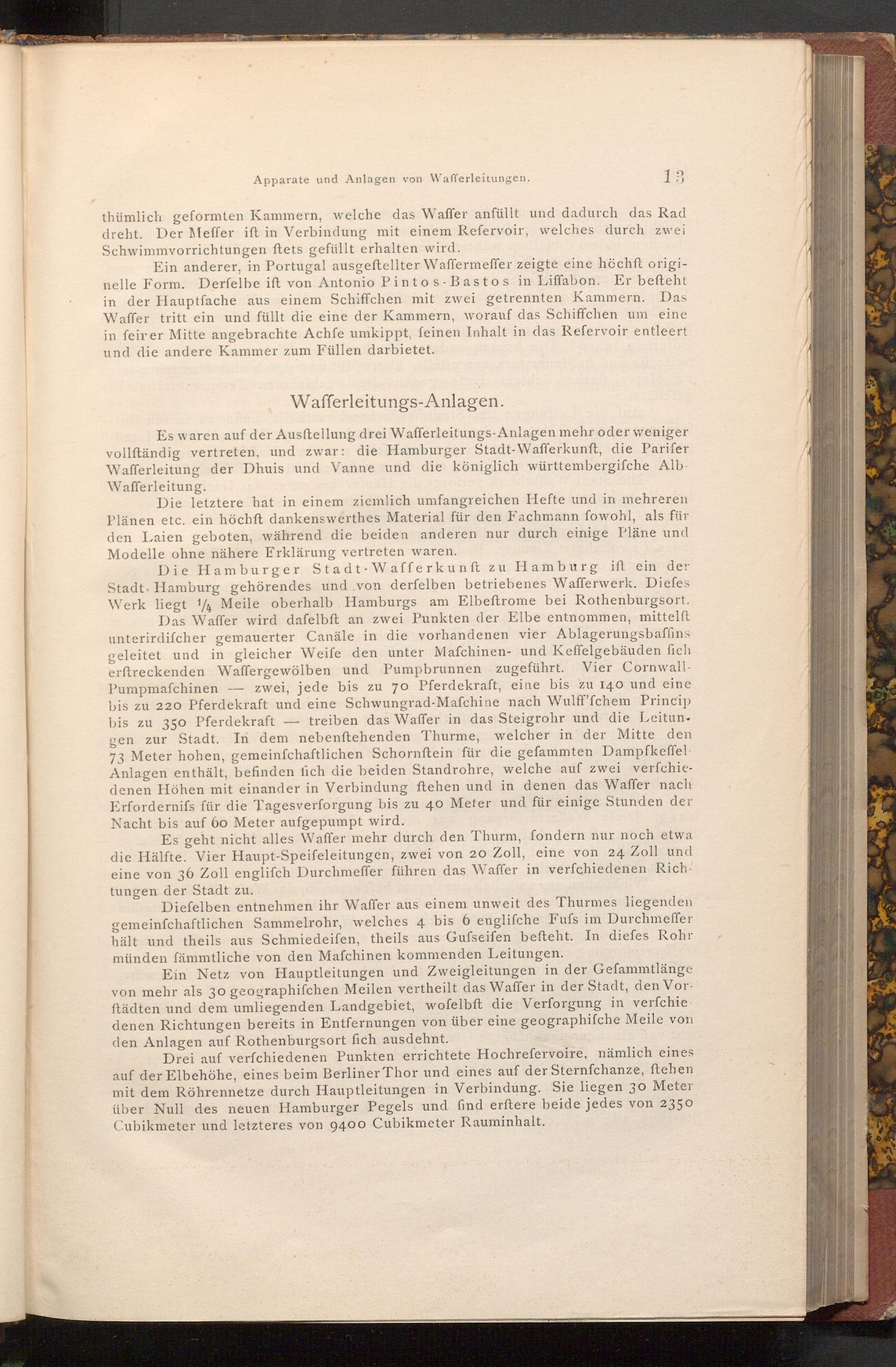 Es waren auf der Ausstellung drei Wafferleitungs- Anlagen mehr oder weniger vollständig vertreten, und zwar die Hamburger Stadt- Wafferkunft, die Parifer Wafferleitung der Dhuis und Vanne und die königlich württembergifche Alb. Wafferleitung.