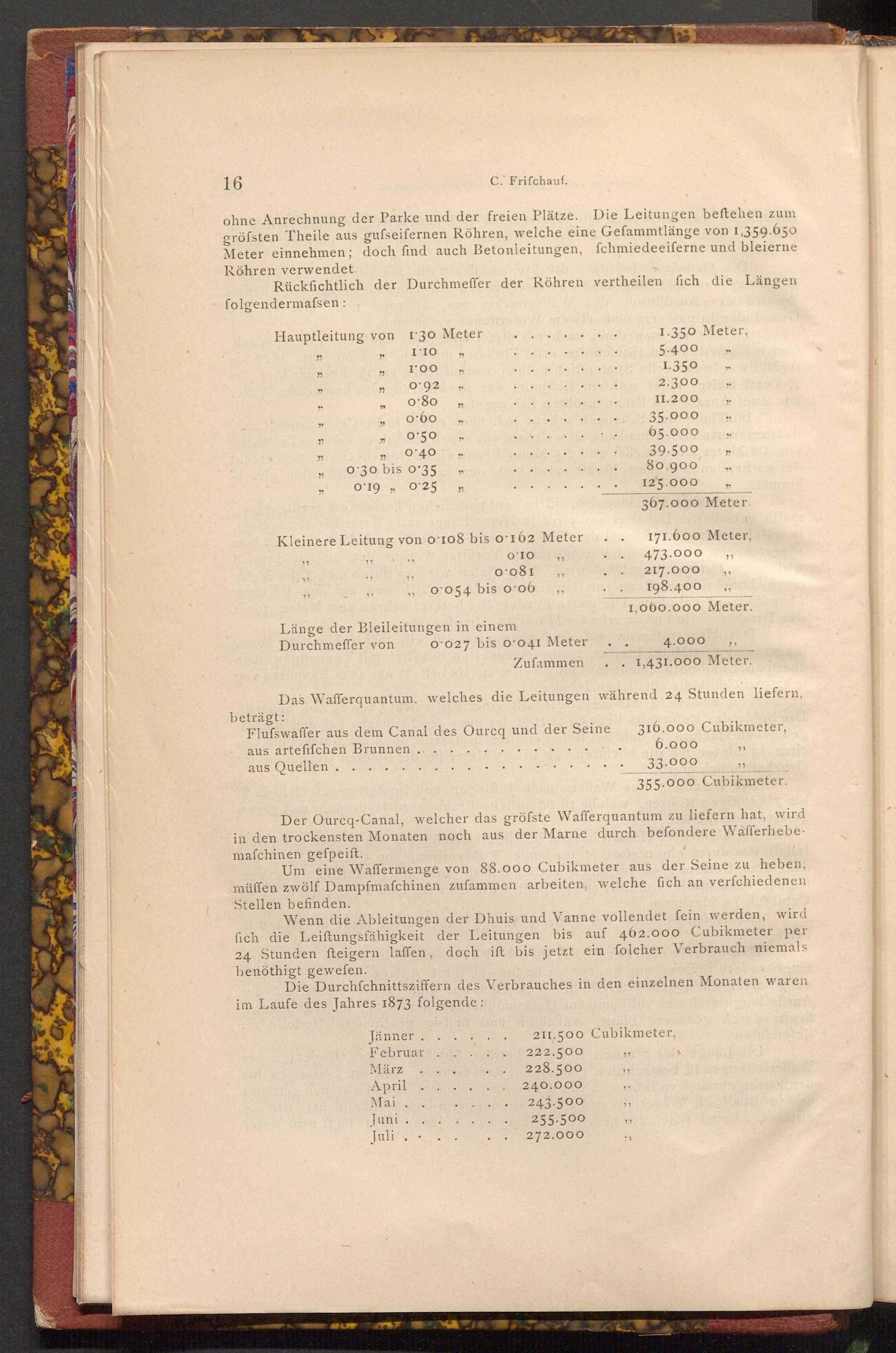 ohne Anrechnung der Parke und der freien Plätze. Die Leitungen beftehen zum gröfsten Theile aus gufseifernen Röhren, welche eine Gefammtlänge von 1,359.650 Meter einnehmen; doch find auch Betonleitungen, fchmiedeeiferne und bleierne Röhren verwendet.