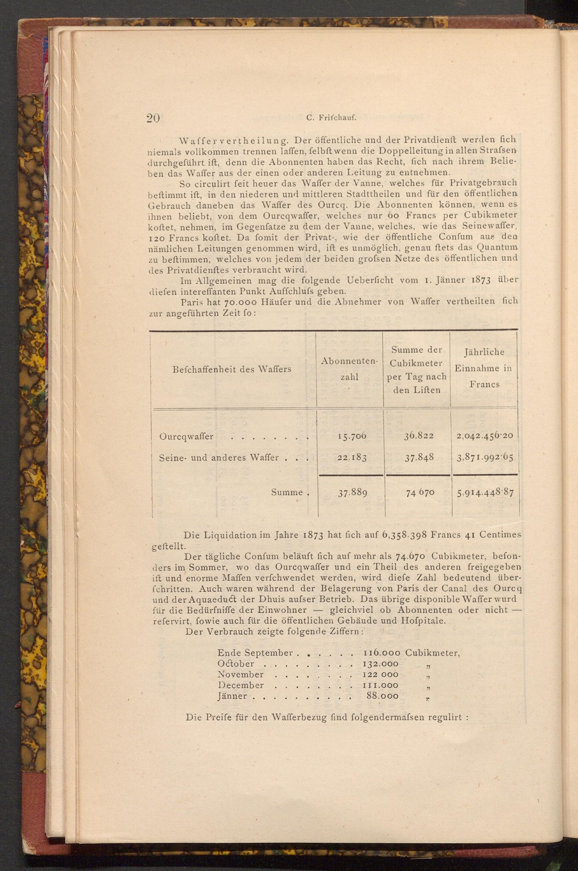 Der tägliche Confum beläuft sich auf mehr als 74.670 Cubikmeter, befonders im Sommer, wo das Ourcqwaffer und ein Theil des anderen freigegeben ift und enorme Maffen verfchwendet werden, wird diefe Zahl bedeutend überfchritten. Auch waren während der Belagerung von Paris der Canal des Ourcq und der Aquaeduct der Dhuis aufser Betrieb. Das übrige disponible Waffer wurd für die Bedürfniffe der Einwohner gleichviel ob Abonnenten oder nicht refervirt, fowie auch für die öffentlichen Gebäude und Hofpitale. Der Verbrauch zeigte folgende Ziffern:"