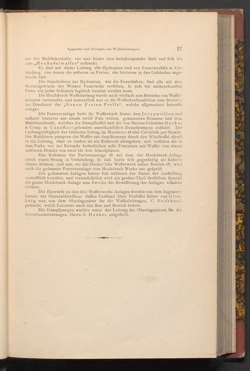 Die gefammten Anlagen haben fich während der Dauer der Ausftellung vortrefflich bewährt, und vorausfichtlich wird ein grofser Theil derfelben, fpeciell die ganze Hochdruck- Anlage zum Zwecke der Bewäfferung der Anlagen erhalten bleiben.