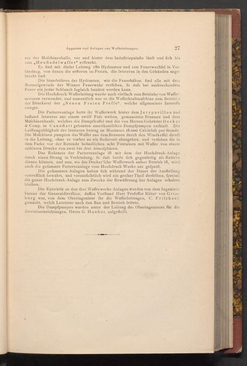 Die Entwürfe zu den drei Wafferwerks- Anlagen wurden von dem Ingenieur bureau der General direction, deffen Vorftand Herr Profeffor Ritter von Grimburg war, von dem Oberingenieur für die Wafferleitungen, C. Frifchauf, gemacht, welch Letzterer auch den Bau und Betrieb leitete.