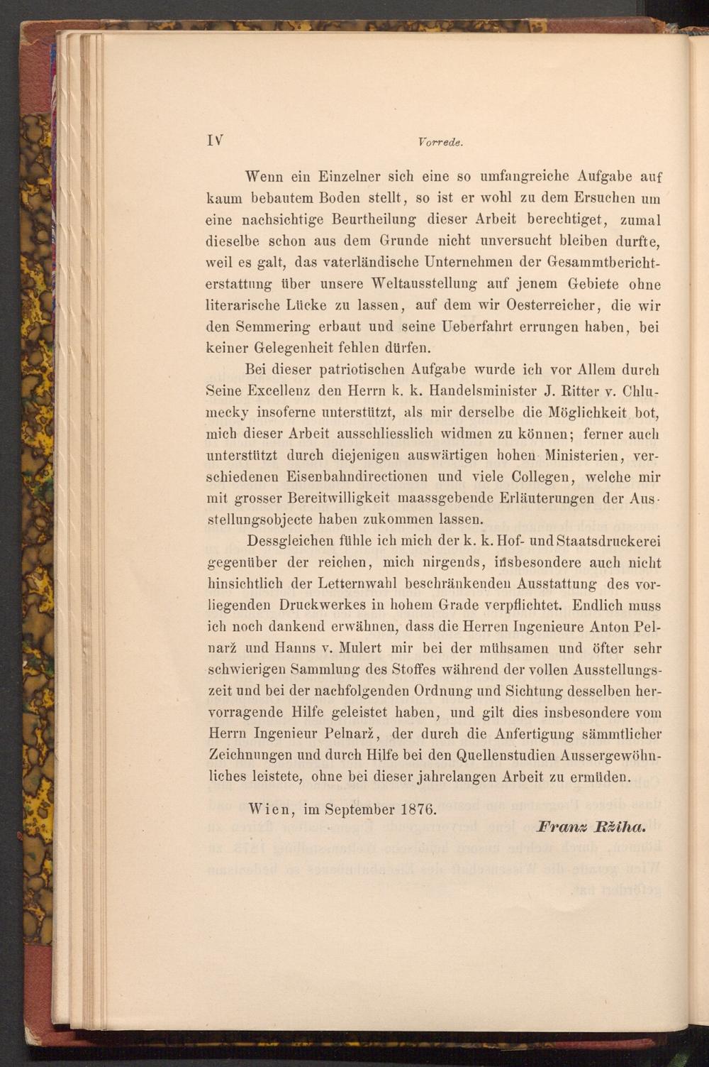 Bei dieser patriotischen Aufgabe wurde ich vor Allem durch Seine Excellenz den Herrn k. k. Handelsminister J. Ritter v. Chlumecky insoferne unterstützt, als mir derselbe die Möglichkeit bot, mich dieser Arbeit ausschliesslich widmen zu können; ferner auch unterstützt durch diejenigen auswärtigen hohen Ministerien, verschiedenen Eisenbahndirectionen und viele Collegen, welche mir mit grosser Bereitwilligkeit maassgebende Erläuterungen der Aus. stellungsobjecte haben zukommen lassen.