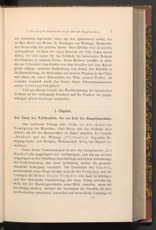 Das belebende Princip aller Cultur ist die räumliche Bewegung der Menschen, ihrer Ideen und der Producte ihrer Arbeit; als die vier Hauptanlässe zu dieser zwischen der Ursache ,, Denken" und der Wirkung„ Civilisation" liegenden Bewegung lassen sich Religion, Wissenschaft, Krieg und Handel bezeichnen.