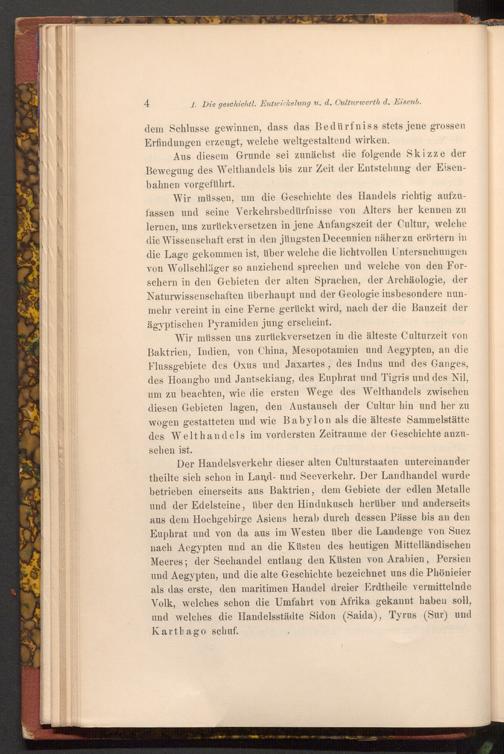 Wir müssen uns zurückversetzen in die älteste Culturzeit von Baktrien, Indien, von China, Mesopotamien und Aegypten, an die Flussgebiete des Oxus und Jaxartes, des Indus und des Ganges, des Hoangho und Jantsekiang, des Euphrat und Tigris und des Nil, um zu beachten, wie die ersten Wege des Welthandels zwischen diesen Gebieten lagen, den Austausch der Cultur hin und her zu wogen gestatteten und wie Babylon als die älteste Sammelstätte des Welthandels im vordersten Zeitraume der Geschichte anzusehen ist.