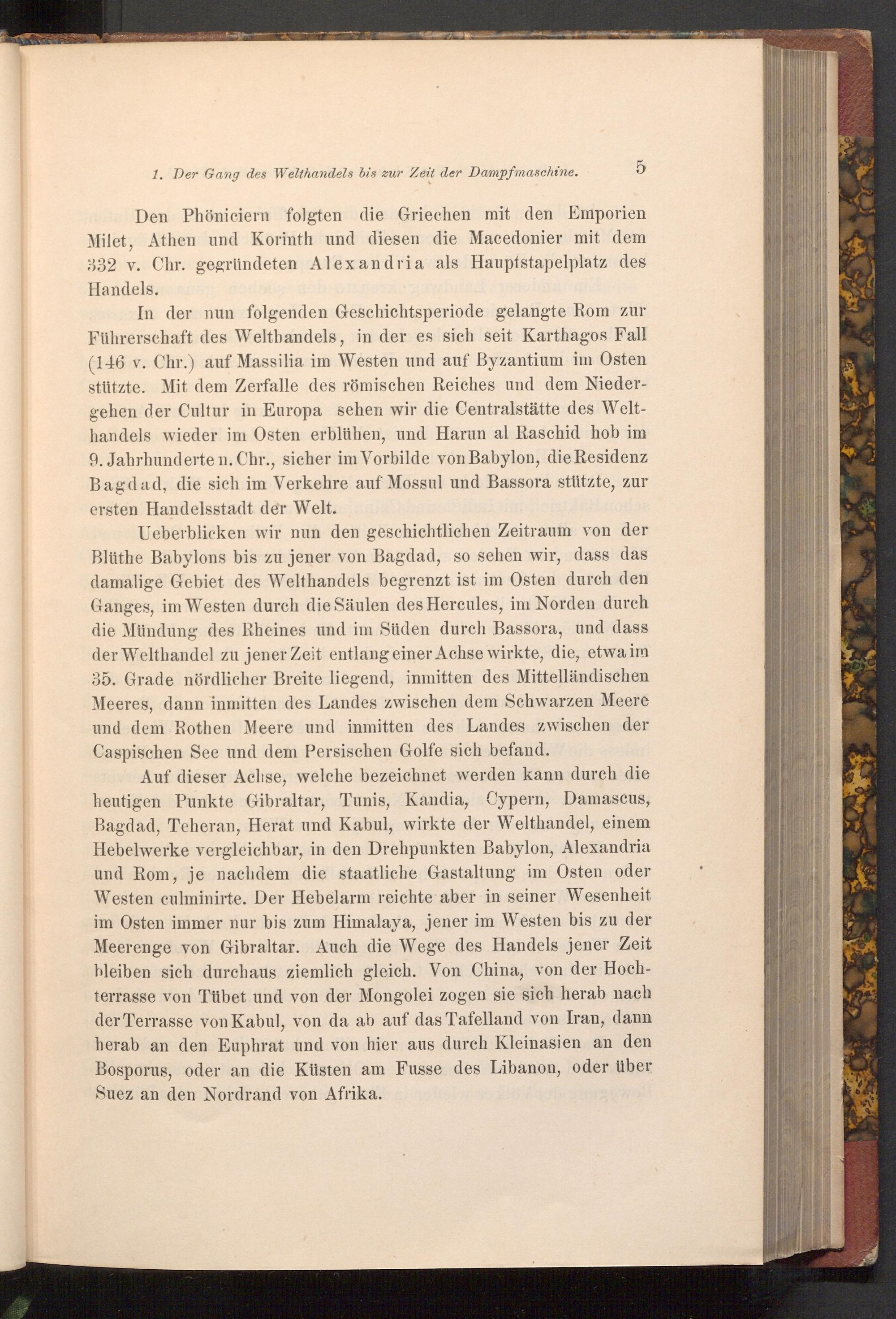 Auf dieser Achise, welche bezeichnet werden kann durch die heutigen Punkte Gibraltar, Tunis, Kandia, Cypern, Damascus, Bagdad, Teheran, Herat und Kabul, wirkte der Welthandel, einem Hebelwerke vergleichbar, in den Drehpunkten Babylon, Alexandria und Rom, je nachdem die staatliche Gastaltung im Osten oder Westen culminirte. Der Hebelarm reichte aber in seiner Wesenheit im Osten immer nur bis zum Himalaya, jener im Westen bis zu der Meerenge von Gibraltar. Auch die Wege des Handels jener Zeit bleiben sich durchaus ziemlich gleich. Von China, von der Hochterrasse von Tübet und von der Mongolei zogen sie sich herab nach der Terrasse von Kabul, von da ab auf das Tafelland von Iran, dann herab an den Euphrat und von hier aus durch Kleinasien an den Bosporus, oder an die Küsten am Fusse des Libanon, oder über Suez an den Nordrand von Afrika.