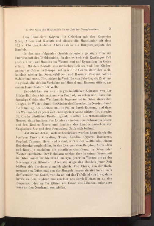 Ueberblicken wir nun den geschichtlichen Zeitraum von der Blüthe Babylons bis zu jener von Bagdad, so sehen wir, dass das damalige Gebiet des Welthandels begrenzt ist im Osten durch den Ganges, im Westen durch die Säulen des Hercules, im Norden durch die Mündung des Rheines und im Süden durch Bassora, und dass der Welthandel zu jener Zeit entlang einer Achse wirkte, die, etwa im 35. Grade nördlicher Breite liegend, inmitten des Mittelländischen Meeres, dann inmitten des Landes zwischen dem Schwarzen Meere und dem Rothen Meere und inmitten des Landes zwischen der Caspischen See und dem Persischen Golfe sich befand.