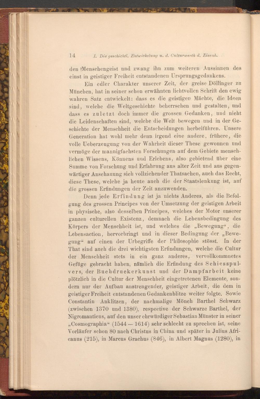 Denn jede Erfindung ist ja nichts Anderes, als die Befolgung des grossen Principes von der Umsetzung der geistigen Arbeit in physische, also desselben Principes, welches der Motor unserer ganzen culturellen Existenz, demnach die Lebensbedingung des Körpers der Menschheit ist, und welches die„ Bewegung", die Lebensaction, hervorbringt und in dieser Bedingung der„ Bewegung" auf einen der Urbegriffe der Philosophie stösst. In der That sind auch die drei wichtigsten Erfindungen, welche die Cultur der Menschheit stets in ein ganz anderes, vervollkommnetes Gefüge gebracht haben, nämlich die Erfindung des Schiesspulvers, der Buchdruckerkunst und der Dampfarbeit keine plötzlich in die Cultur der Menschheit eingetretenen Elemente, sondern nur der Aufbau anstrengender, geistiger Arbeit, die dem in geistiger Freiheit entstandenen Gedankenblitze weiter folgte. Sowie Constantin Anklitzen, der nachmalige Mönch Barthel Schwarz ( zwischen 1370 und 1380), respective der Schwarze Barthel, der Nigromanticus, auf den unser ehrwürdiger Sebastian Münster in seiner " Cosmographia"( 1544-1614) sehr schlecht zu sprechen ist, seine Vorläufer schon 80 nach Christus in China und später in Julius Africanus( 215), in Marcus Grachus( 846), in Albert Magnus( 1280), in