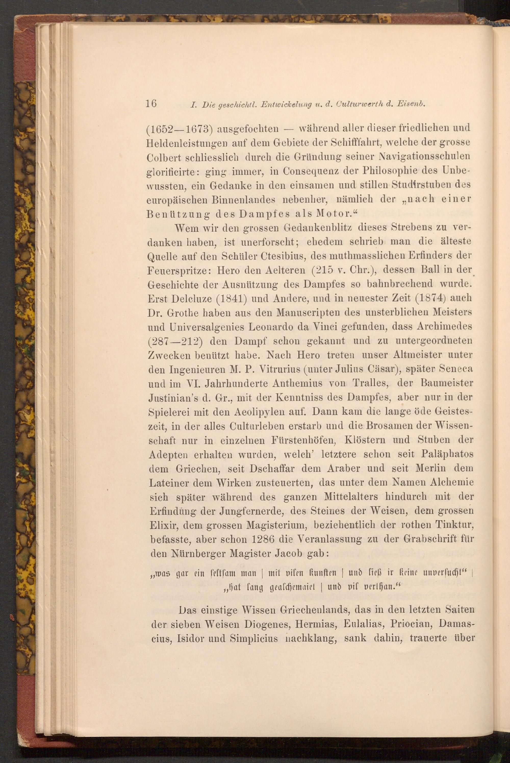 Wem wir den grossen Gedankenblitz dieses Strebens zu verdanken haben, ist unerforscht; ehedem schrieb man die älteste Quelle auf den Schüler Ctesibius, des muthmasslichen Erfinders der Feuerspritze: Hero den Aelteren( 215 v. Chr.), dessen Ball in der Geschichte der Ausnützung des Dampfes so bahnbrechend wurde. Erst Delcluze( 1841) und Andere, und in neuester Zeit( 1874) auch Dr. Grothe haben aus den Manuscripten des unsterblichen Meisters und Universalgenies Leonardo da Vinci gefunden, dass Archimedes ( 287-212) den Dampf schon gekannt und zu untergeordneten Zwecken benützt habe. Nach Hero treten unser Altmeister unter den Ingenieuren M. P. Vitrurius( unter Julius Cäsar), später Seneca und im VI. Jahrhunderte Anthemius von Tralles, der Baumeister Justinian's d. Gr., mit der Kenntniss des Dampfes, aber nur in der Spielerei mit den Aeolipylen auf. Dann kam die lange öde Geisteszeit, in der alles Culturleben erstarb und die Brosamen der Wissenschaft nur in einzelnen Fürstenhöfen, Klöstern und Stuben der Adepten erhalten wurden, welch' letztere schon seit Paläphatos dem Griechen, seit Dschaffar dem Araber und seit Merlin dem Lateiner dem Wirken zusteuerten, das unter dem Namen Alchemie sich später während des ganzen Mittelalters hindurch mit der Erfindung der Jungfernerde, des Steines der Weisen, dem grossen Elixir, dem grossen Magisterium, beziehentlich der rothen Tinktur, befasste, aber schon 1286 die Veranlassung zu der Grabschrift für den Nürnberger Magister Jacob gab: