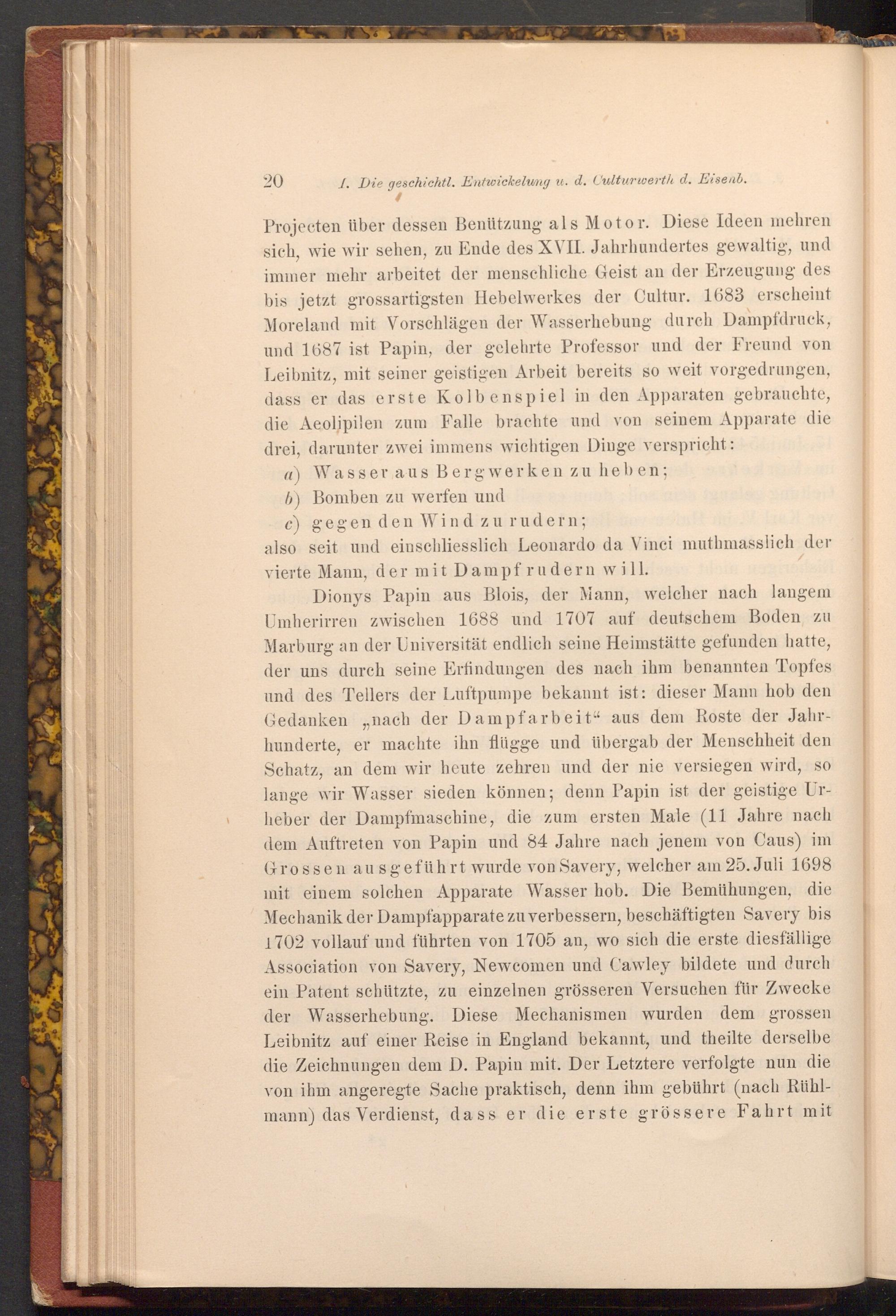 1. Die geschichtl. Entwickelung u. d. Culturwerth d. Eisenb. Projecten über dessen Benützung als Motor. Diese Ideen mehren sich, wie wir sehen, zu Ende des XVII. Jahrhundertes gewaltig, und immer mehr arbeitet der menschliche Geist an der Erzeugung des bis jetzt grossartigsten Hebelwerkes der Cultur. 1683 erscheint Moreland mit Vorschlägen der Wasserhebung durch Dampfdruck, und 1687 ist Papin, der gelehrte Professor und der Freund von Leibnitz, mit seiner geistigen Arbeit bereits so weit vorgedrungen, dass er das erste Kolbenspiel in den Apparaten gebrauchte, die Aeolipilen zum Falle brachte und von seinem Apparate die drei, darunter zwei immens wichtigen Dinge verspricht: