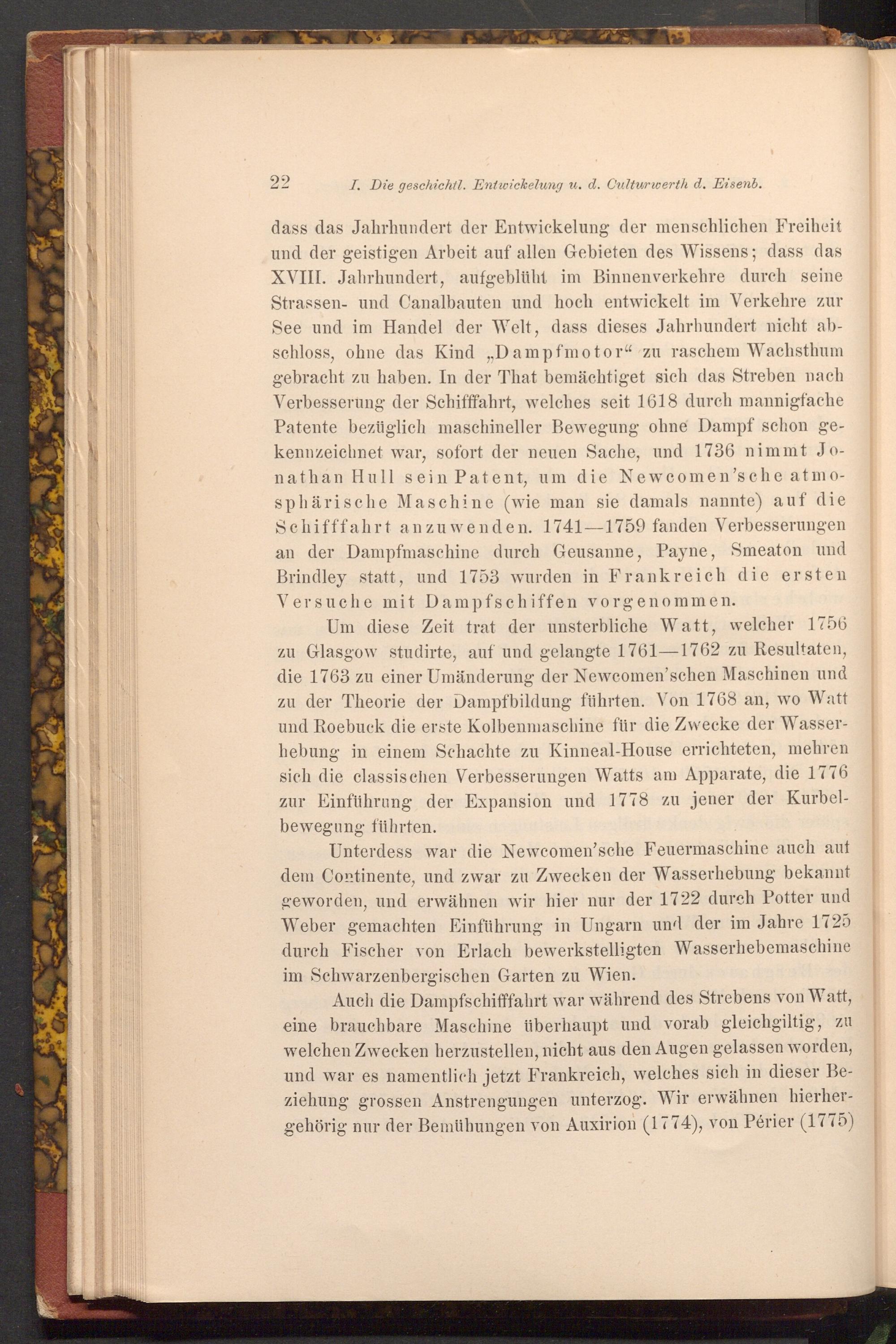 dass das Jahrhundert der Entwickelung der menschlichen Freiheit und der geistigen Arbeit auf allen Gebieten des Wissens; dass das XVIII. Jahrhundert, aufgeblüht im Binnenverkehre durch seine Strassen- und Canalbauten und hoch entwickelt im Verkehre zur See und im Handel der Welt, dass dieses Jahrhundert nicht abschloss, ohne das Kind ,, Dampfmotor" zu raschem Wachsthum gebracht zu haben. In der That bemächtiget sich das Streben nach Verbesserung der Schifffahrt, welches seit 1618 durch mannigfache Patente bezüglich maschineller Bewegung ohne Dampf schon gekennzeichnet war, sofort der neuen Sache, und 1736 nimmt Jonathan Hull sein Patent, um die Newcomen'sche atmosphärische Maschine( wie man sie damals nannte) auf die Schifffahrt anzuwenden. 1741-1759 fanden Verbesserungen an der Dampfmaschine durch Geusanne, Payne, Smeaton und Brindley statt, und 1753 wurden in Frankreich die ersten Versuche mit Dampfschiffen vorgenommen.