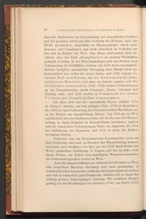 Um diese Zeit trat der unsterbliche Watt, welcher 1756 zu Glasgow studirte, auf und gelangte 1761-1762 zu Resultaten, die 1763 zu einer Umänderung der Newcomen'schen Maschinen und zu der Theorie der Dampfbildung führten. Von 1768 an, wo Watt und Roebuck die erste Kolbenmaschine für die Zwecke der Wasserhebung in einem Schachte zu Kinneal- House errichteten, mehren sich die classischen Verbesserungen Watts am Apparate, die 1776 zur Einführung der Expansion und 1778 zu jener der Kurbelbewegung führten.