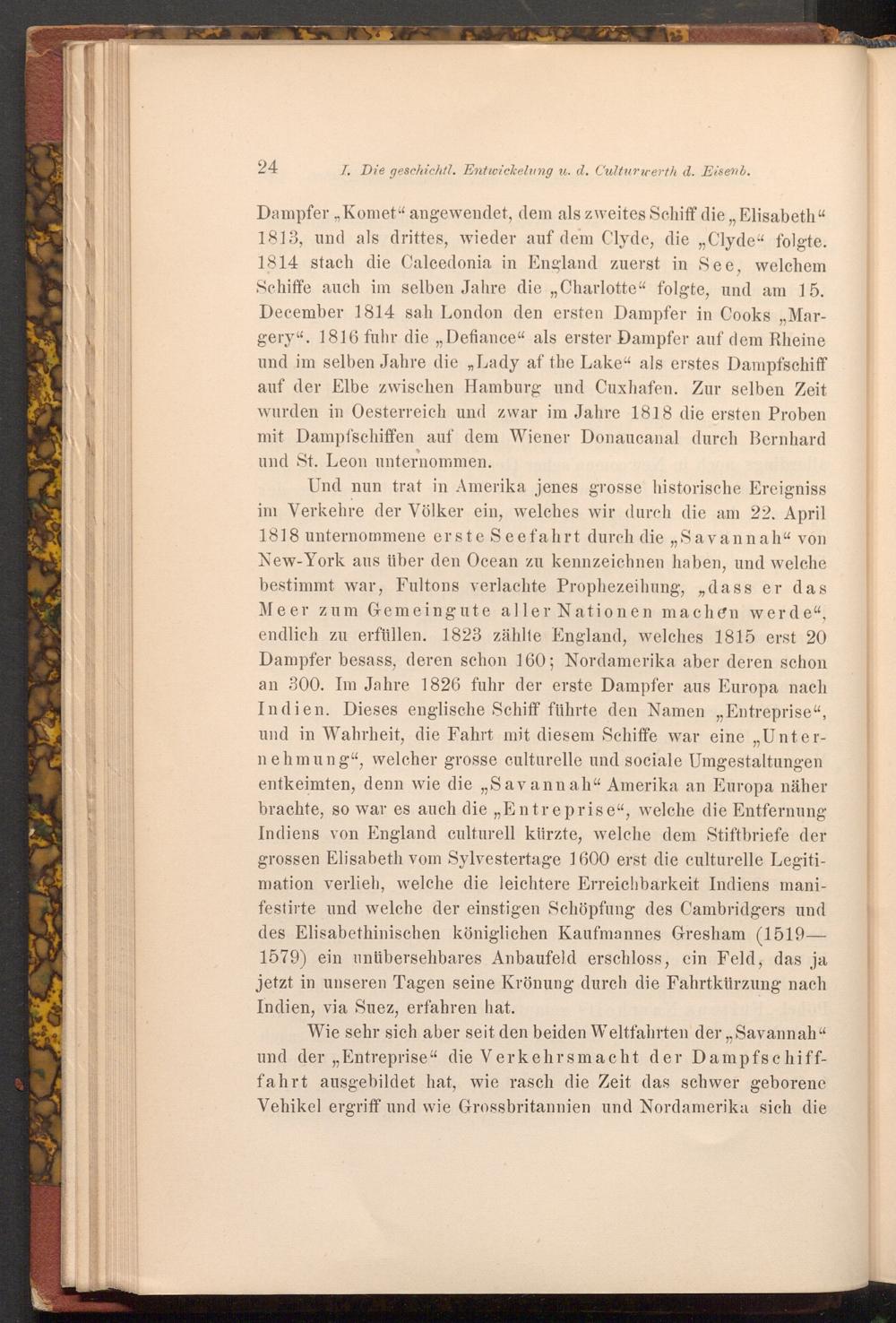 Und nun trat in Amerika jenes grosse historische Ereigniss im Verkehre der Völker ein, welches wir durch die am 22. April 1818 unternommene erste Seefahrt durch die ,, Savannah" von New- York aus über den Ocean zu kennzeichnen haben, und welche bestimmt war, Fultons verlachte Prophezeihung, dass er das Meer zum Gemeingute aller Nationen machen werde", endlich zu erfüllen. 1823 zählte England, welches 1815 erst 20 Dampfer besass, deren schon 160; Nordamerika aber deren schon an 300. Im Jahre 1826 fuhr der erste Dampfer aus Europa nach Indien. Dieses englische Schiff führte den Namen„ Entreprise", und in Wahrheit, die Fahrt mit diesem Schiffe war eine„ Unternehmung", welcher grosse culturelle und sociale Umgestaltungen entkeimten, denn wie die ,, Savannah" Amerika an Europa näher brachte, so war es auch die ,, Entreprise", welche die Entfernung Indiens von England culturell kürzte, welche dem Stiftbriefe der grossen Elisabeth vom Sylvestertage 1600 erst die culturelle Legitimation verlieh, welche die leichtere Erreichbarkeit Indiens manifestirte und welche der einstigen Schöpfung des Cambridgers und des Elisabethinischen königlichen Kaufmannes Gresham( 15191579) ein unübersehbares Anbaufeld erschloss, ein Feld, das ja jetzt in unseren Tagen seine Krönung durch die Fahrtkürzung nach Indien, via Suez, erfahren hat.