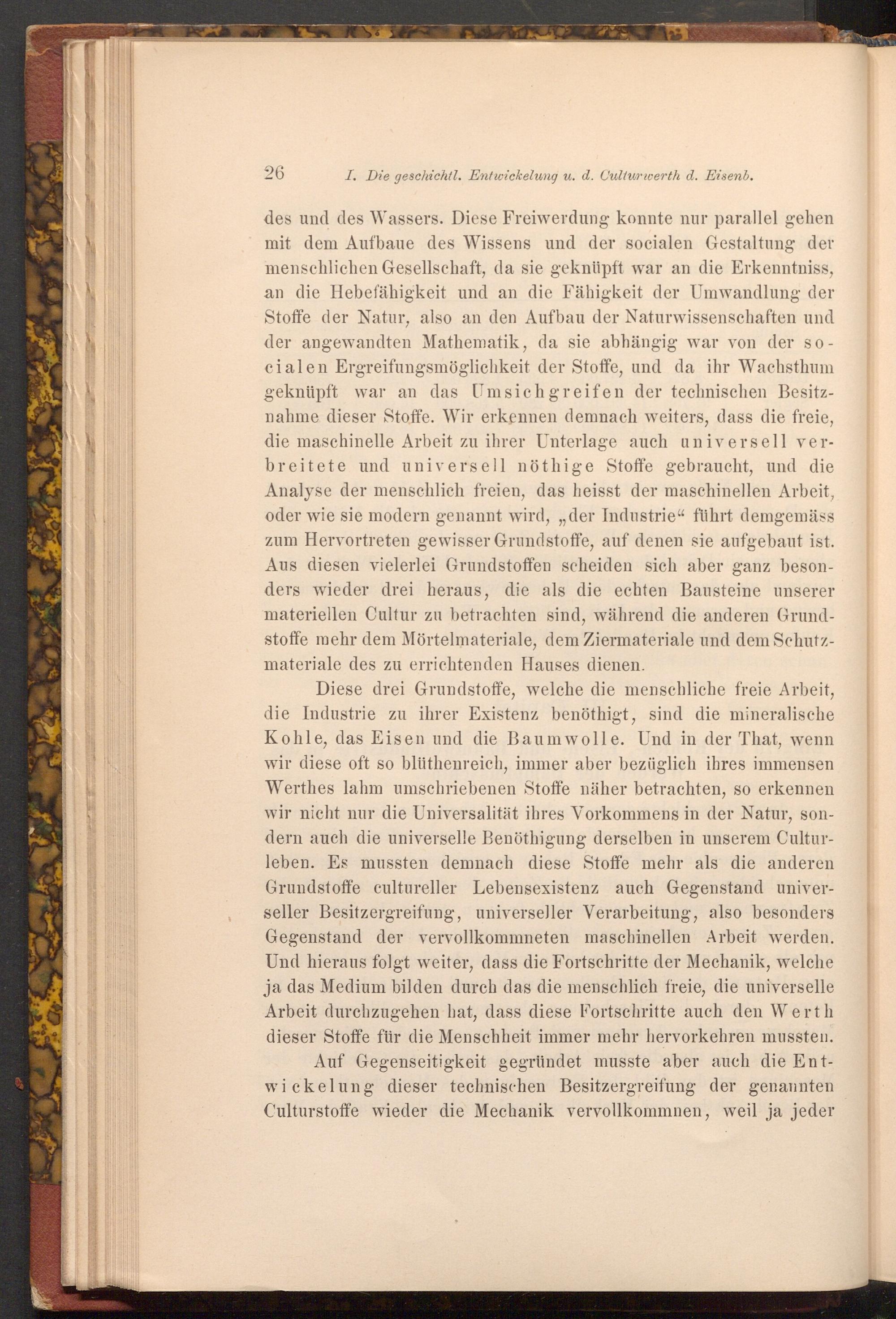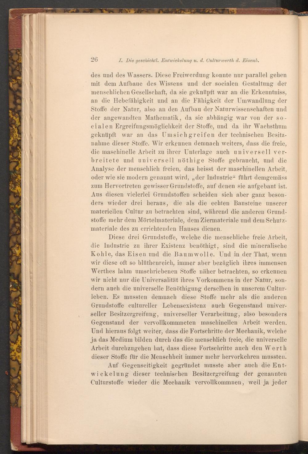 Diese drei Grundstoffe, welche die menschliche freie Arbeit, die Industrie zu ihrer Existenz benöthigt, sind die mineralische Kohle, das Eisen und die Baumwolle. Und in der That, wenn wir diese oft so blüthenreich, immer aber bezüglich ihres immensen Werthes lahm umschriebenen Stoffe näher betrachten, so erkennen wir nicht nur die Universalität ihres Vorkommens in der Natur, sondern auch die universelle Benöthigung derselben in unserem Culturleben. Es mussten demnach diese Stoffe mehr als die anderen Grundstoffe cultureller Lebensexistenz auch Gegenstand universeller Besitzergreifung, universeller Verarbeitung, also besonders Gegenstand der vervollkommneten maschinellen Arbeit werden. Und hieraus folgt weiter, dass die Fortschritte der Mechanik, welche ja das Medium bilden durch das die menschlich freie, die universelle Arbeit durchzugehen hat, dass diese Fortschritte auch den Werth dieser Stoffe für die Menschheit immer mehr hervorkehren mussten.