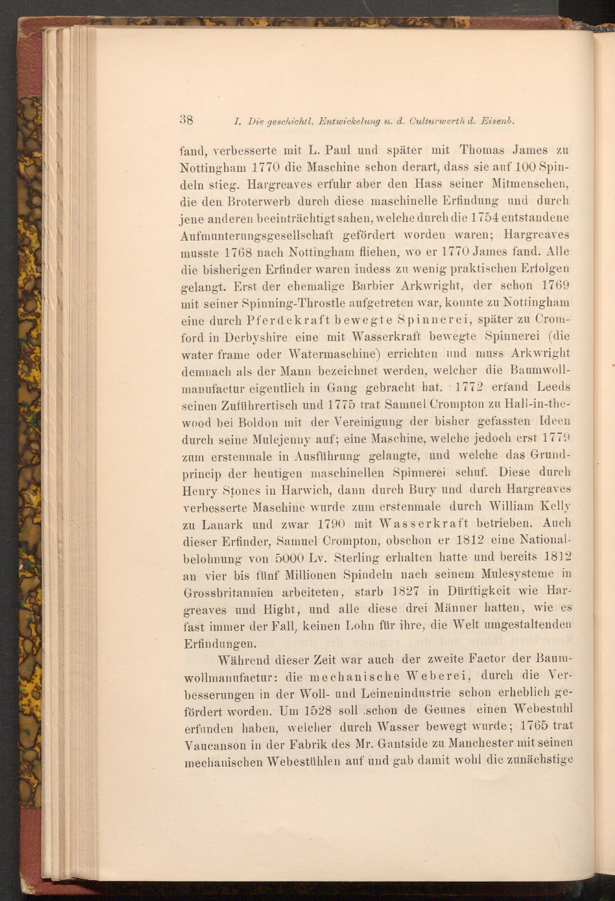 I. Die geschichtl. Entwickelung u. d. Culturwerth d. Eisenb. fand, verbesserte mit L. Paul und später mit Thomas James zu Nottingham 1770 die Maschine schon derart, dass sie auf 100 Spindeln stieg. Hargreaves erfuhr aber den Hass seiner Mitmenschen, die den Broterwerb durch diese maschinelle Erfindung und durch jene anderen beeinträchtigt sahen, welche durch die 1754 entstandene Aufmunterungsgesellschaft gefördert worden waren; Hargreaves musste 1768 nach Nottingham fliehen, wo er 1770 James fand. Alle die bisherigen Erfinder waren indess zu wenig praktischen Erfolgen gelangt. Erst der ehemalige Barbier Arkwright, der schon 1769 mit seiner Spinning- Throstle aufgetreten war, konnte zu Nottingham eine durch Pferdekraft bewegte Spinnerei, später zu Cromford in Derbyshire eine mit Wasserkraft bewegte Spinnerei( die water frame oder Watermaschine) errichten und muss Arkwright demnach als der Mann bezeichnet werden, welcher die Baumwollmanufactur eigentlich in Gang gebracht hat. 1772 erfand Leeds seinen Zuführertisch und 1775 trat Samuel Crompton zu Hall- in- thewood bei Boldon mit der Vereinigung der bisher gefassten Ideen durch seine Mulejenny auf; eine Maschine, welche jedoch erst 1779 zum erstenmale in Ausführung gelangte, und welche das Grundprincip der heutigen maschinellen Spinnerei schuf. Diese durch Henry Stones in Harwich, dann durch Bury und durch Hargreaves verbesserte Maschine wurde zum erstenmale durch William Kelly zu Lanark und zwar 1790 mit Wasserkraft betrieben. Auch dieser Erfinder, Samuel Crompton, obschon er 1812 eine Nationalbelohnung von 5000 Lv. Sterling erhalten hatte und bereits 1812 an vier bis fünf Millionen Spindeln nach seinem Mulesysteme in Grossbritannien arbeiteten, starb 1827 in Dürftigkeit wie Hargreaves und Hight, und alle diese drei Männer hatten, wie es fast immer der Fall, keinen Lohn für ihre, die Welt umgestaltenden Erfindungen.