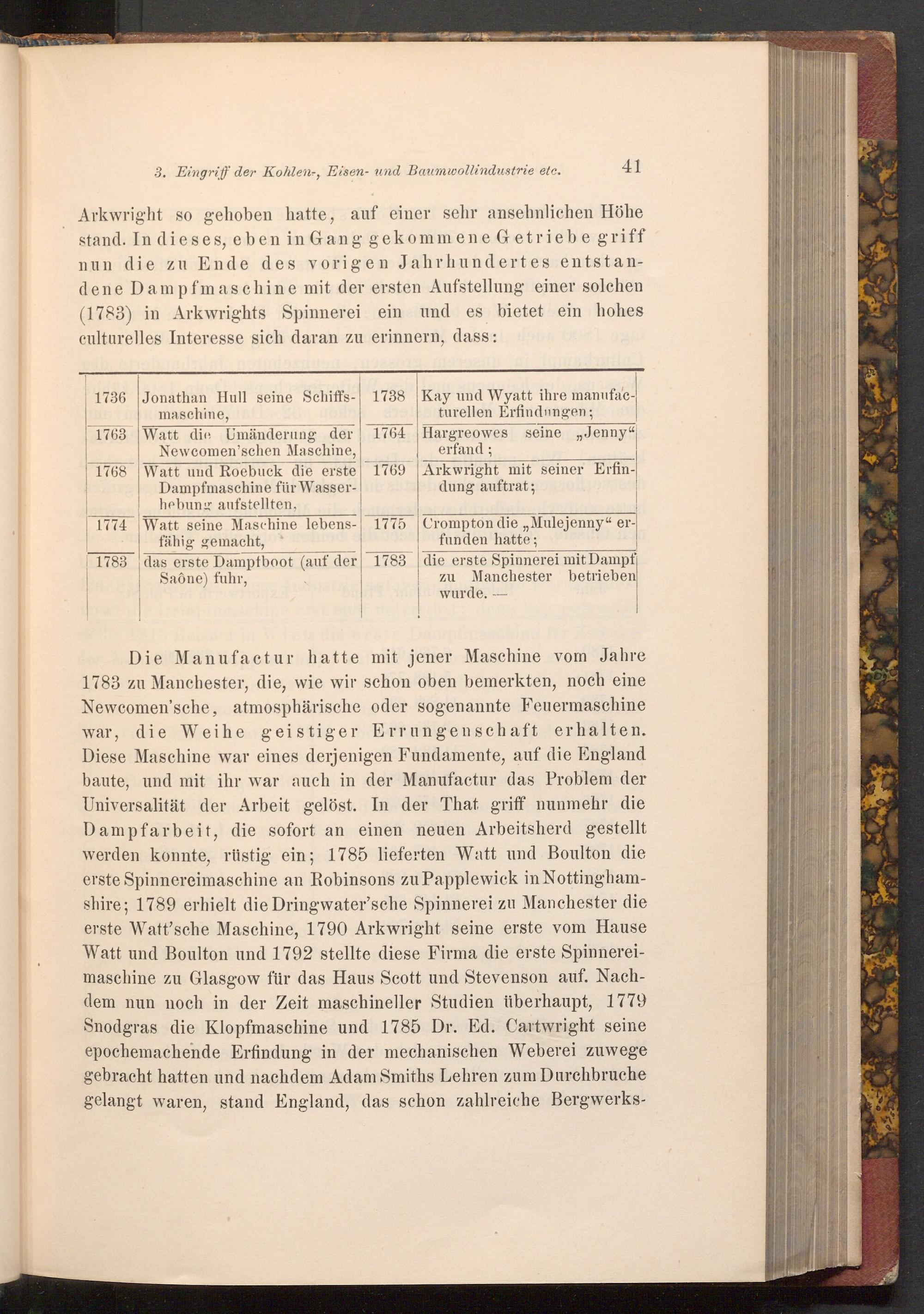 3. Eingriff der Kohlen-, Eisen- und Baumwollindustrie etc. Arkwright so gehoben hatte, auf einer sehr ansehnlichen Höhe stand. In dieses, eben in Gang gekommene Getriebe griff nun die zu Ende des vorigen Jahrhundertes entstandene Dampfmaschine mit der ersten Aufstellung einer solchen ( 1783) in Arkwrights Spinnerei ein und es bietet ein hohes culturelles Interesse sich daran zu erinnern, dass:
