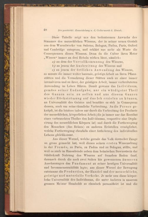 Aus dieser Wurzel, welche gerade das Volk deutscher Zunge so gross gemacht hat, weil dieses seinen ersten Wissensdrang in der Fremde, zu Paris, zu Padua und zu Bologna, stillte, und weil es auch im Hansabunde neben dem heimischen Bewusstsein der Städtekraft Nahrung des Wissens auf fremdem Boden fand, demnach durch die nach zwei Seiten hin gewonnenen äusseren Anschauungen das Fundament zu seiner heutigen Universalität und Incommensurabilität legte; aus dieser Wurzel der Bewegung entstammt die Production, der Handel und der menschliche, geistige und materielle Verkehr. Je mehr nun diese körperliche Universalität des Individuums, die unter Anderen in unserem grossen Meister Humboldt so classisch personificirt ist und die