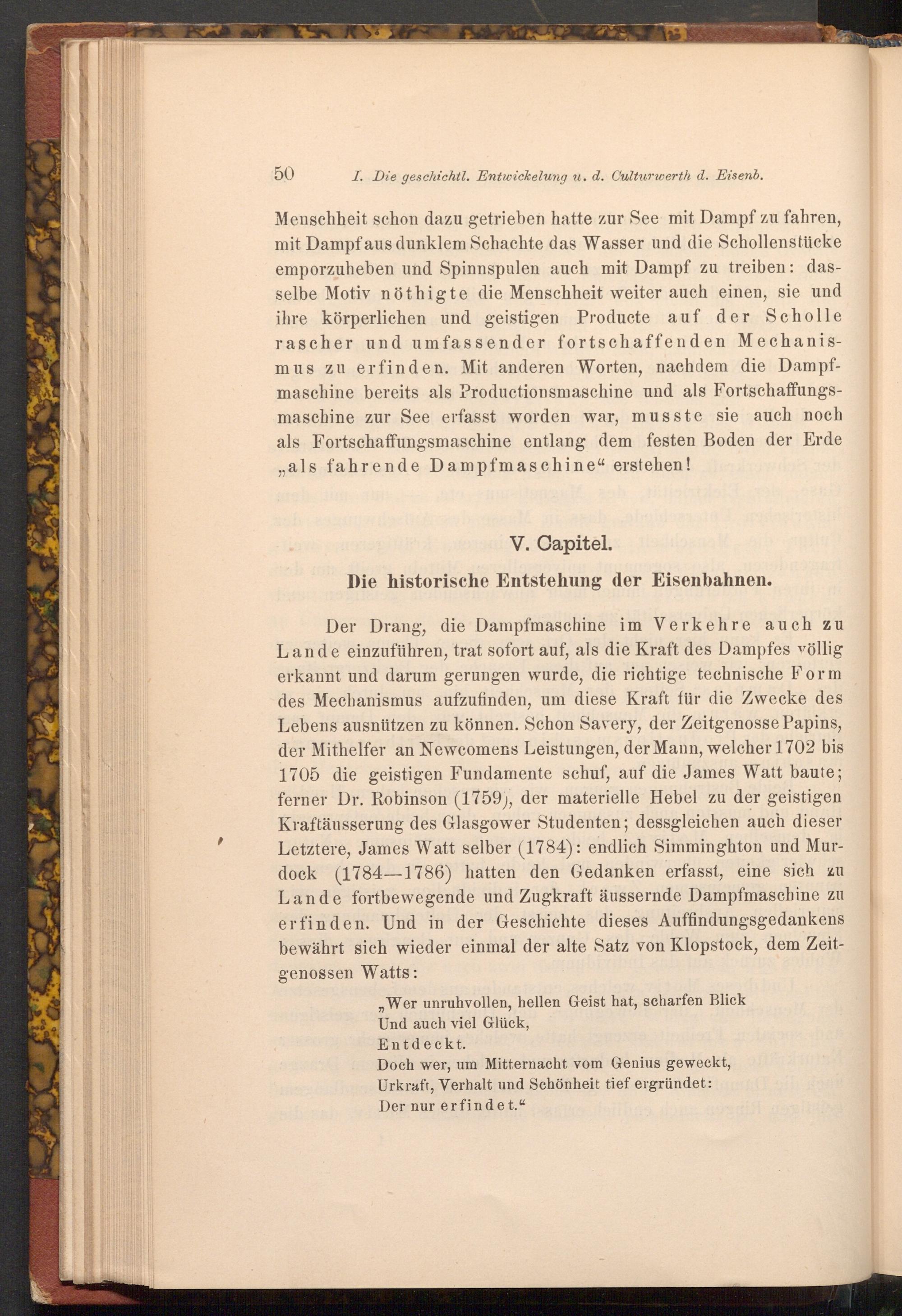 I. Die geschichtl. Entwickelung u. d. Culturwerth d. Eisenb. Menschheit schon dazu getrieben hatte zur See mit Dampf zu fahren, mit Dampf aus dunklem Schachte das Wasser und die Schollenstücke emporzuheben und Spinnspulen auch mit Dampf zu treiben: dasselbe Motiv nöthigte die Menschheit weiter auch einen, sie und ihre körperlichen und geistigen Producte auf der Scholle rascher und umfassender fortschaffenden Mechanismus zu erfinden. Mit anderen Worten, nachdem die Dampfmaschine bereits als Productionsmaschine und als Fortschaffungsmaschine zur See erfasst worden war, musste sie auch noch als Fortschaffungsmaschine entlang dem festen Boden der Erde ,, als fahrende Dampfmaschine" erstehen!