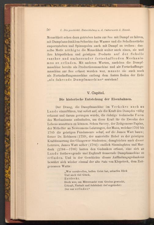 Der Drang, die Dampfmaschine im Verkehre auch zu Lande einzuführen, trat sofort auf, als die Kraft des Dampfes völlig erkannt und darum gerungen wurde, die richtige technische Form des Mechanismus aufzufinden, um diese Kraft für die Zwecke des Lebens ausnutzen zu können. Schon Savery, der Zeitgenosse Papins, der Mithelfer an Newcomens Leistungen, der Mann, welcher 1702 bis 1705 die geistigen Fundamente schuf, auf die James Watt baute; ferner Dr. Robinson( 1759), der materielle Hebel zu der geistigen Kraftäusserung des Glasgower Studenten; dessgleichen auch dieser Letztere, James Watt selber( 1784): endlich Simminghton und Murdock( 1784-1786) hatten den Gedanken erfasst, eine sich zu Lande fortbewegende und Zugkraft äussernde Dampfmaschine zu erfinden. Und in der Geschichte dieses Auffindungsgedankens bewährt sich wieder einmal der alte Satz von Klopstock, dem Zeitgenossen Watts: