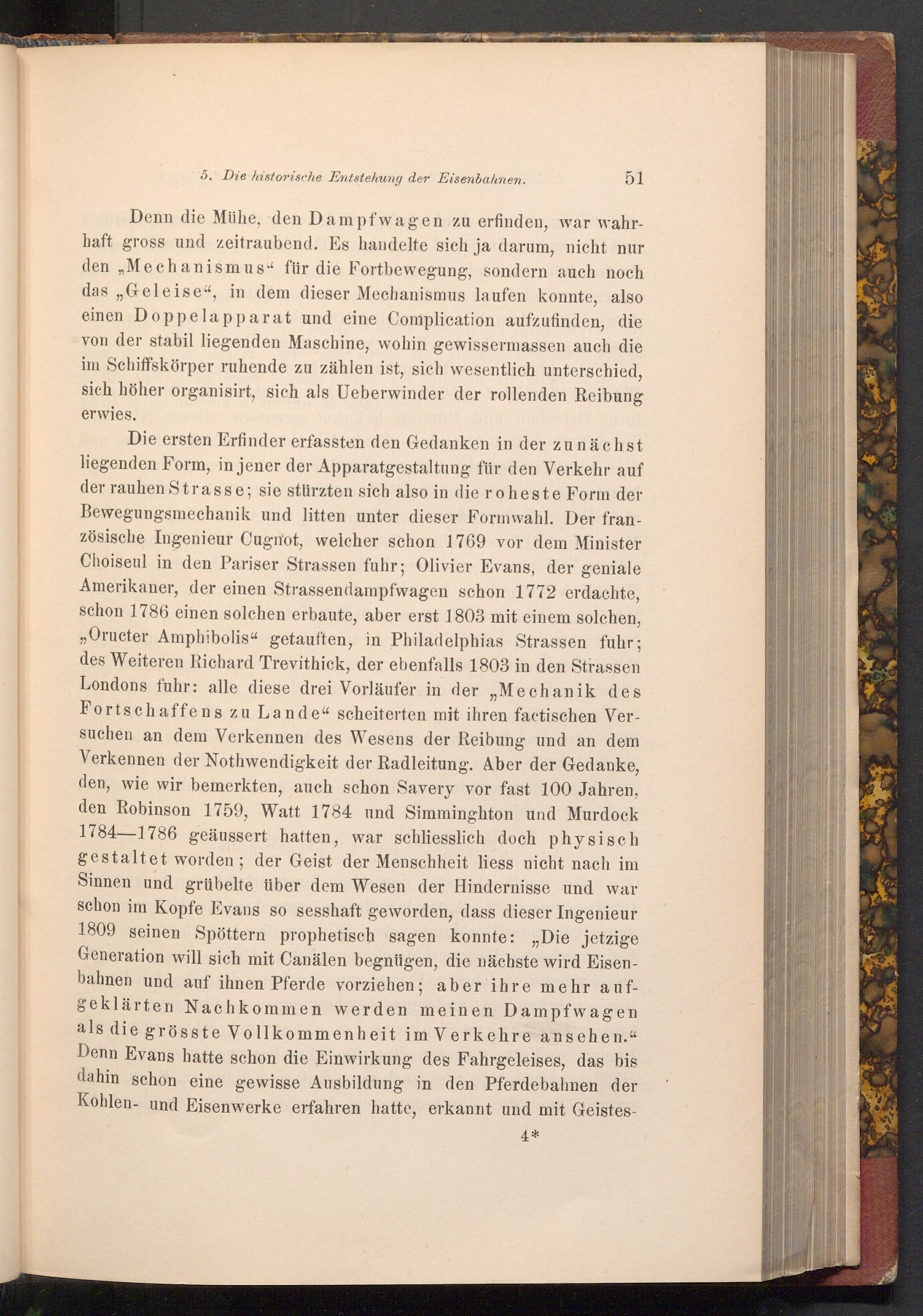 Die ersten Erfinder erfassten den Gedanken in der zunächst liegenden Form, in jener der Apparatgestaltung für den Verkehr auf der rauhen Strasse; sie stürzten sich also in die roheste Form der Bewegungsmechanik und litten unter dieser Formwahl. Der französische Ingenieur Cugnot, welcher schon 1769 vor dem Minister Choiseul in den Pariser Strassen fuhr; Olivier Evans, der geniale Amerikaner, der einen Strassendampfwagen schon 1772 erdachte, schon 1786 einen solchen erbaute, aber erst 1803 mit einem solchen, " Oructer Amphibolis" getauften, in Philadelphias Strassen fuhr; des Weiteren Richard Trevithick, der ebenfalls 1803 in den Strassen Londons fuhr: alle diese drei Vorläufer in der„ Mechanik des Fortschaffens zu Lande" scheiterten mit ihren factischen Versuchen an dem Verkennen des Wesens der Reibung und an dem Verkennen der Nothwendigkeit der Radleitung. Aber der Gedanke, den, wie wir bemerkten, auch schon Savery vor fast 100 Jahren, den Robinson 1759, Watt 1784 und Simminghton und Murdock 1784-1786 geäussert hatten, war schliesslich doch physisch gestaltet worden; der Geist der Menschheit liess nicht nach im Sinnen und grübelte über dem Wesen der Hindernisse und war schon im Kopfe Evans so sesshaft geworden, dass dieser Ingenieur 1809 seinen Spöttern prophetisch sagen konnte:„ Die jetzige Generation will sich mit Canälen begnügen, die nächste wird Eisenbahnen und auf ihnen Pferde vorziehen; aber ihre mehr aufgeklärten Nachkommen werden meinen Dampfwagen als die grösste Vollkommenheit im Verkehre ansehen." Denn Evans hatte schon die Einwirkung des Fahrgeleises, das bis dahin schon eine gewisse Ausbildung in den Pferdebahnen der Kohlen- und Eisenwerke erfahren hatte, erkannt und mit Geistes